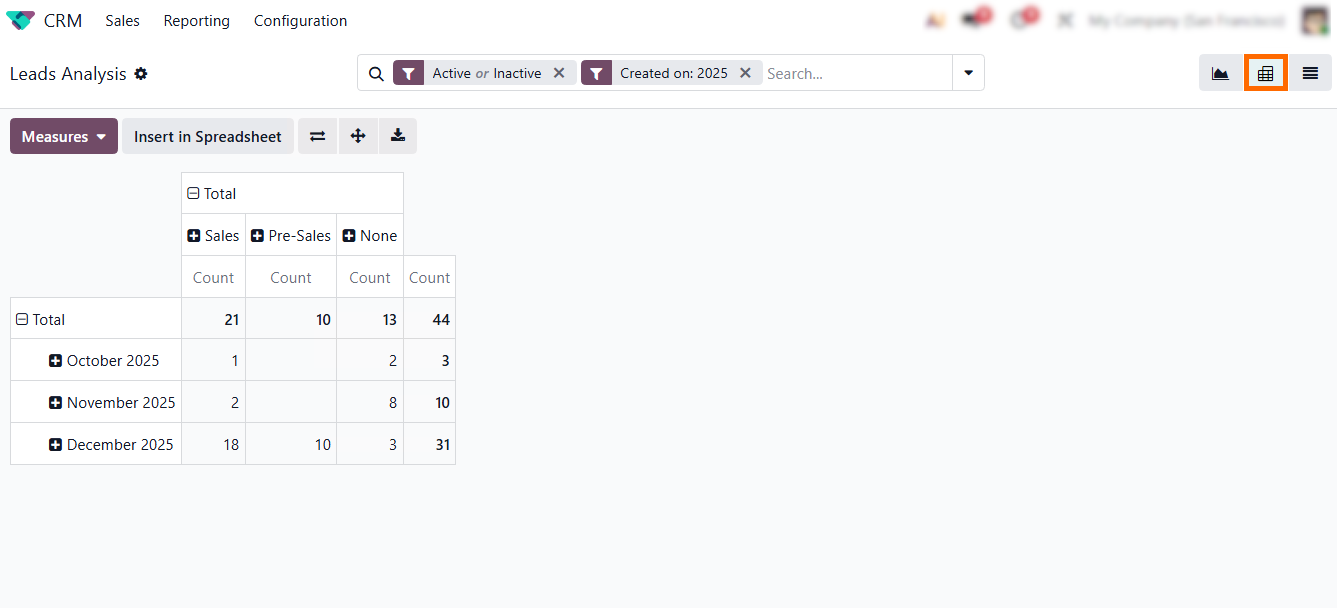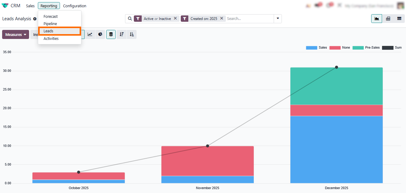 - To analyze the impact of lead enrichment, open the CRM app and go to “Reporting” → “Leads”. This opens the default “Leads Analysis” view, giving a comprehensive overview of all leads in your Odoo CRM pipeline.