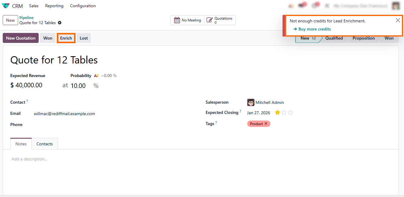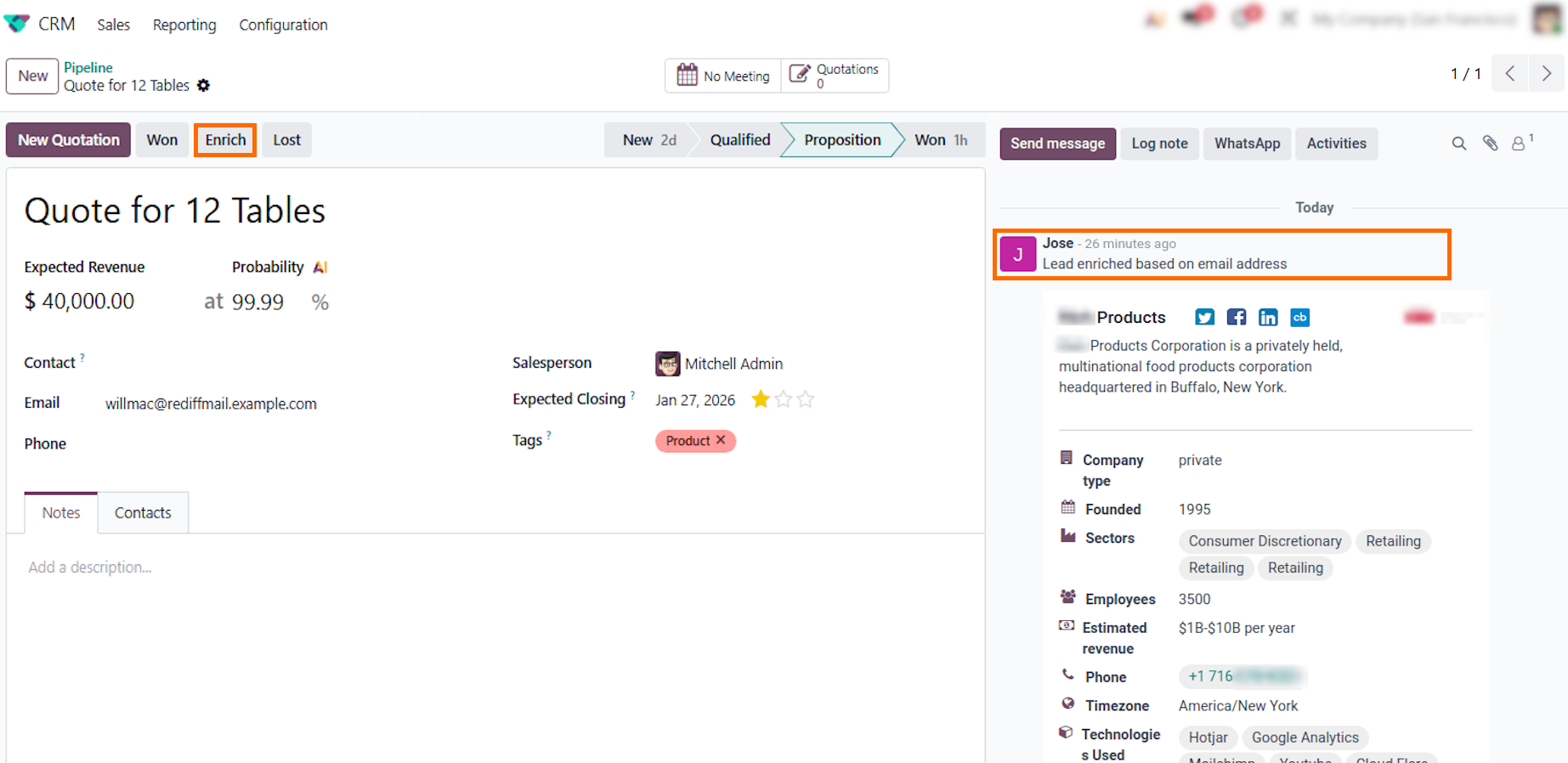 - By clicking “Enrich”, Odoo 19 automatically pulls all available data linked to the lead’s email domain. This paid IAP service costs 1 credit per successful enrichment and is refunded if no data is found.