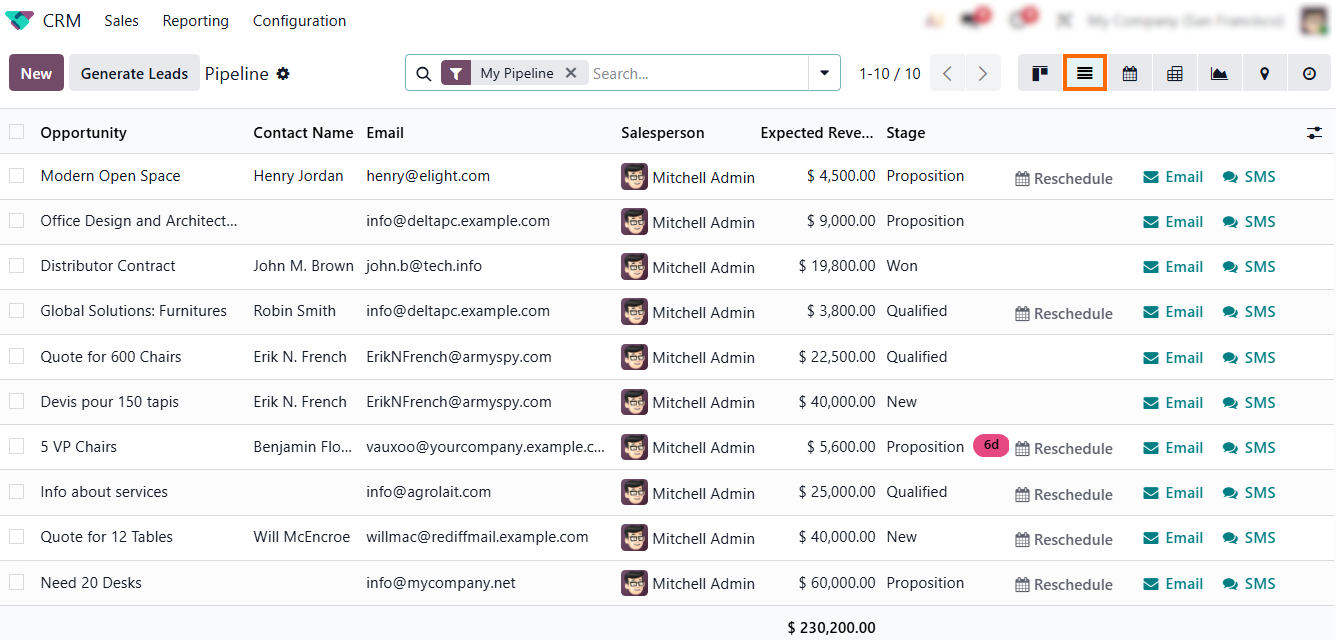- First, switch to the List view by clicking the corresponding view icon, as shown in the screenshot below. The list view makes it easier to review lead records in a structured format and select multiple Odoo leads at once for further actions.