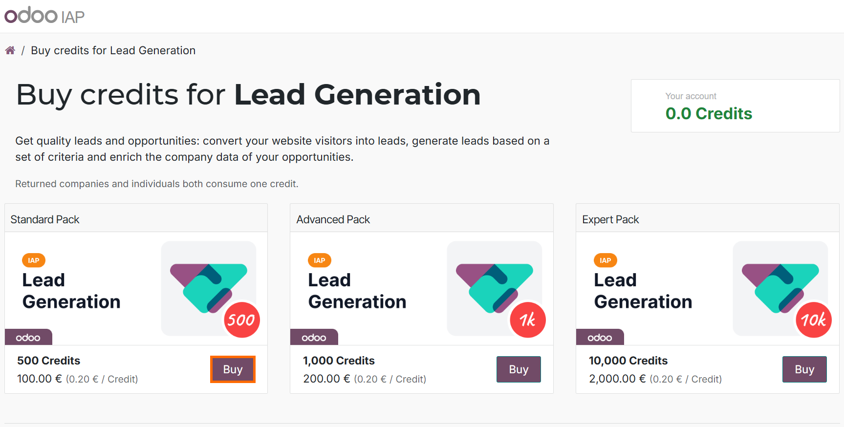 to purchase enrichment credits and enable lead enrichment for the selected Odoo lead, allowing the system to apply