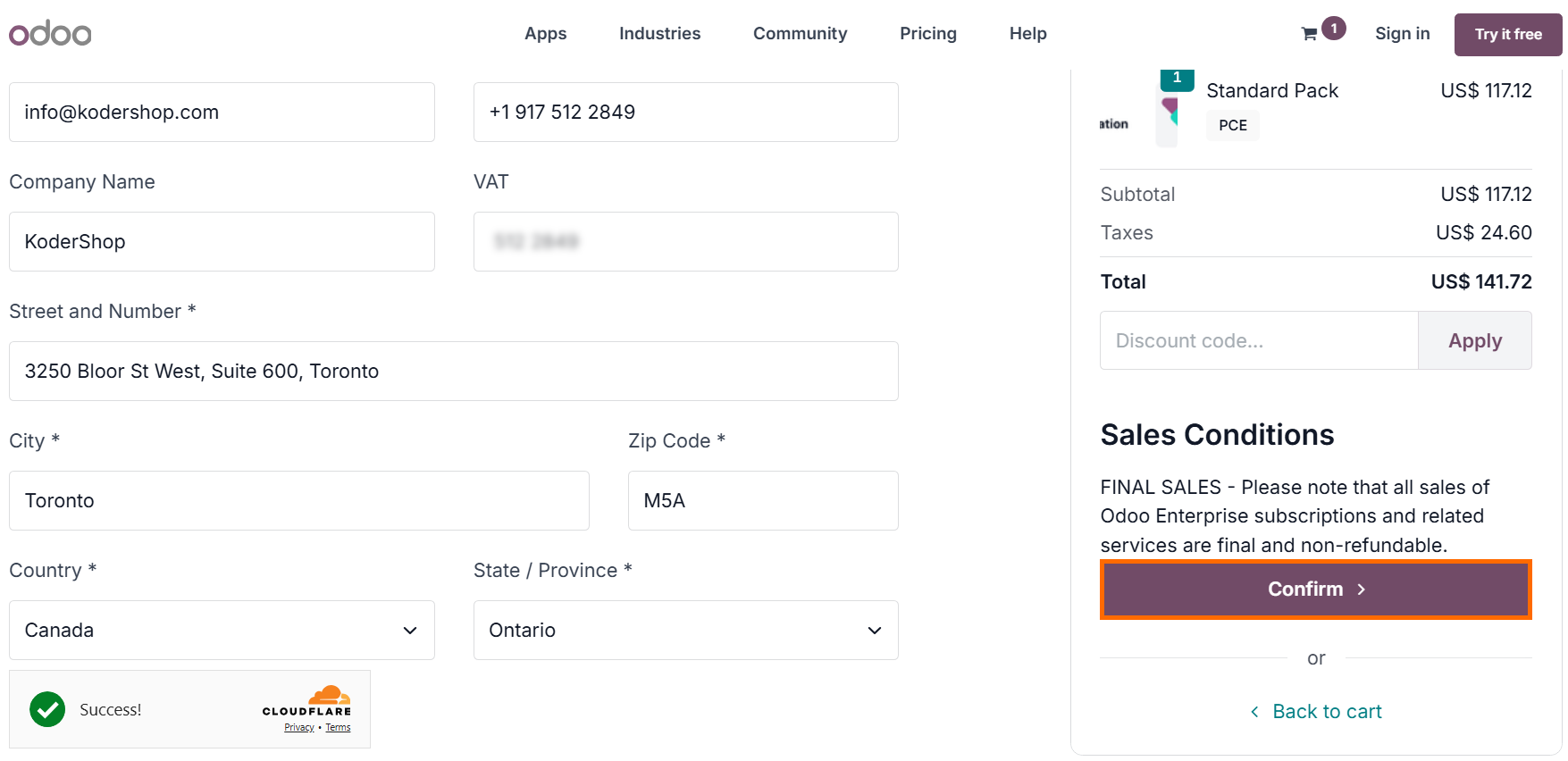 - After reviewing the populated data, such as the company name and contact details, click “Confirm” to apply the enriched information to the Odoo lead and update the record within the CRM pipeline.