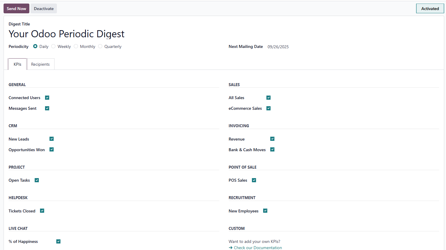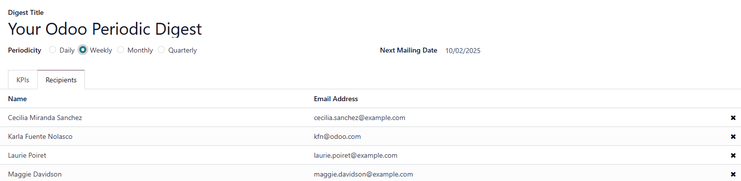 Recipients can be individualized or group-based, ensuring the right people get the right information. Additionally, Odoo Studio allows for custom KPIs if the defaults fall short, like industry-specific metrics.