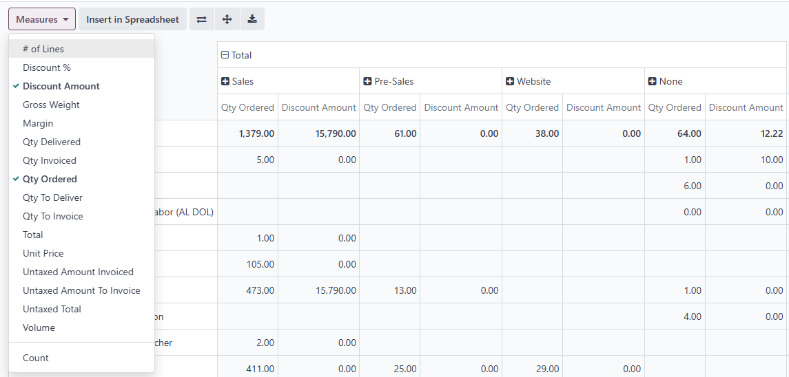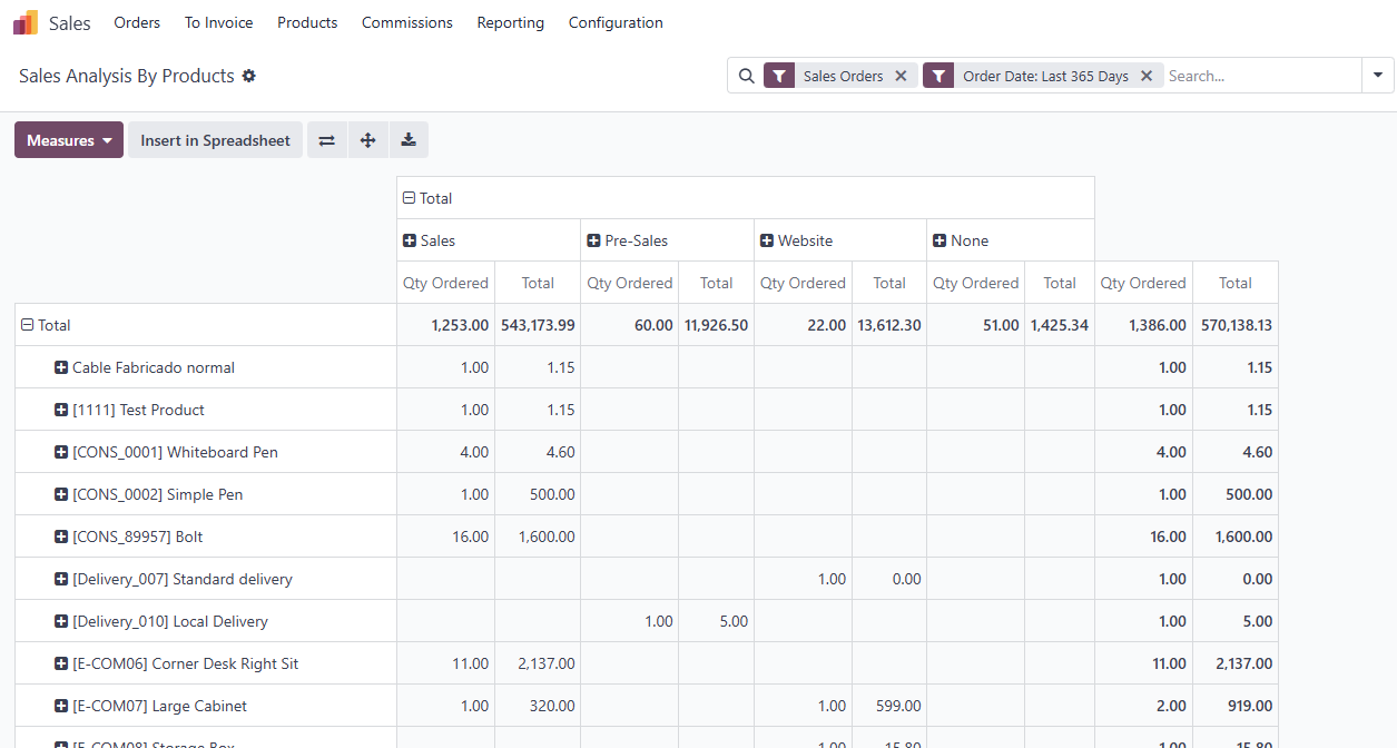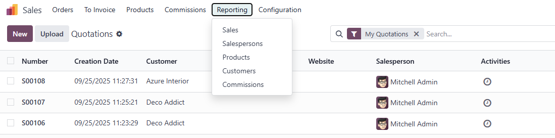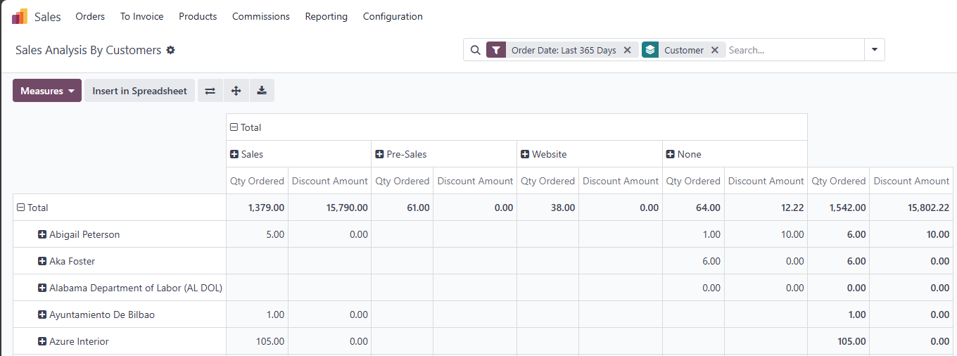 Navigating to the Sales menu and selecting Reporting unveils a variety of report types that cover the essential aspects of sales activities. For instance, the Sales report provides an overview of total sales volume, order amounts, and invoiced sums. This allows you to assess revenue across different periods and business segments, giving you a bird's-eye view of financial health.