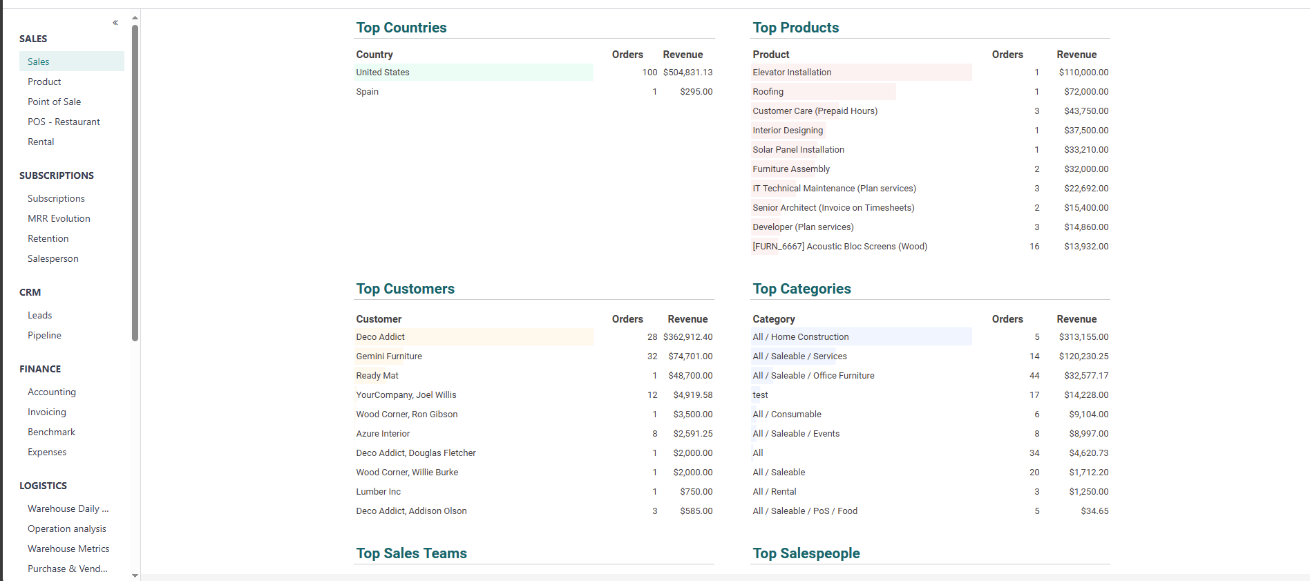 The Salespersons report dives deeper into individual performance, showcasing the efficiency of each sales manager through metrics like Qty Ordered, revenue generated, and average Unit Price value. This is invaluable for performance reviews and incentive planning, helping you reward top performers and coach those who might be lagging.