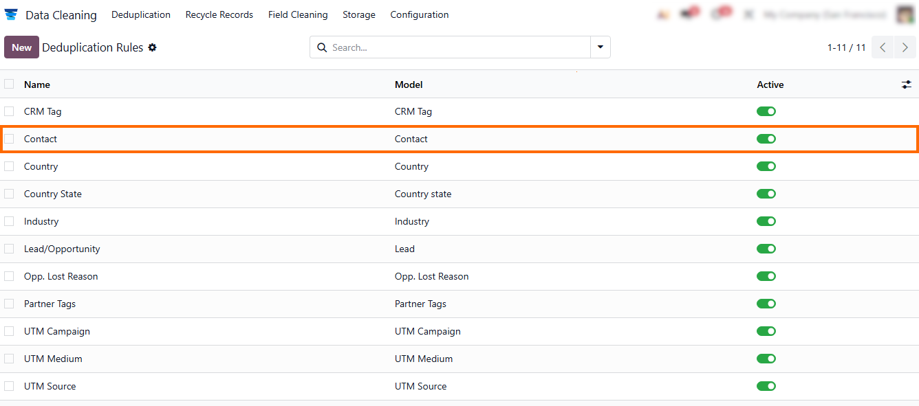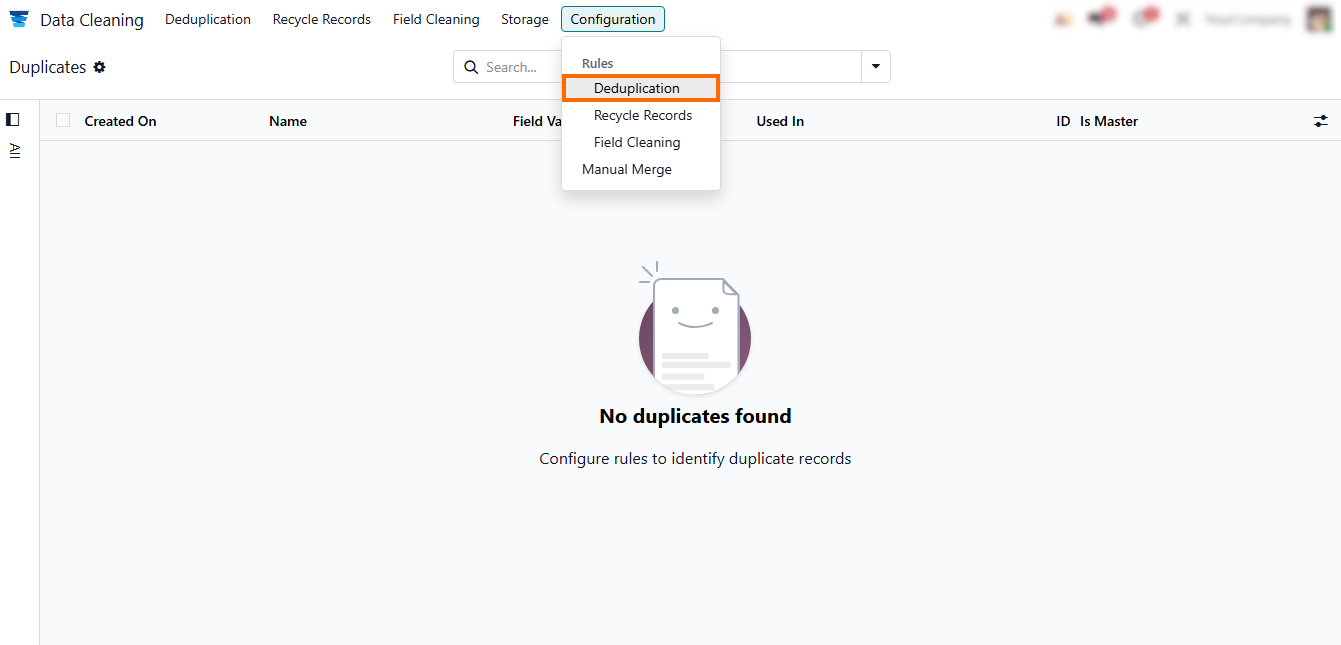 - Open Configuration, then select “Deduplication Rules” in the Odoo Data Cleaning module to access duplicate detection settings. This section centralizes all rule-based logic used by Odoo data cleaning across models.