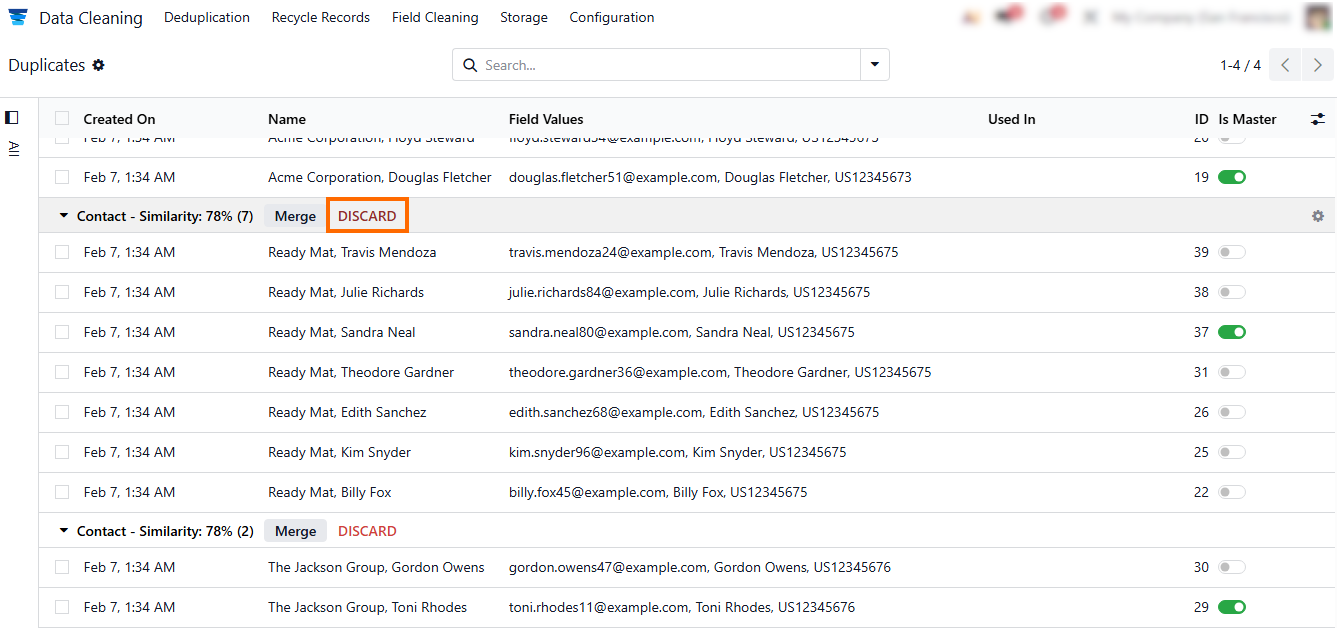 - Discard unnecessary duplicates – use the “Discard” action for records that are clearly redundant, inactive, or no longer needed. This removes them from active workflows while keeping historical links safe.