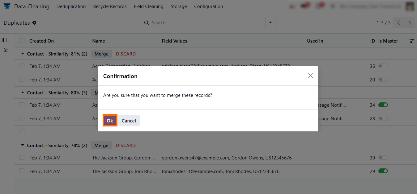 - Confirm the merge – after selecting the master record, click “OK” to finalize the merge and update all related records across the Odoo module list, as shown in the screenshot below.