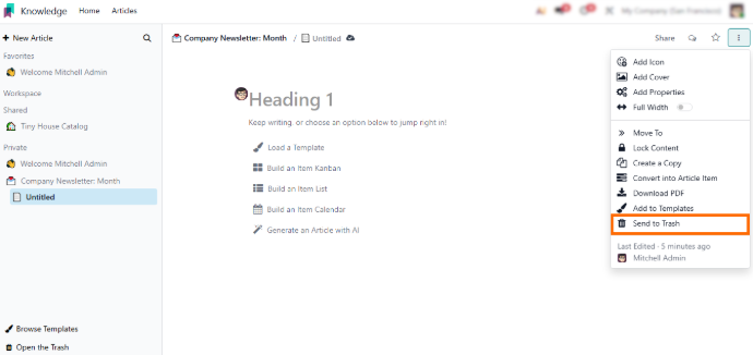 - Finally, you can remove a subtopic or an entire article by clicking “Send to Trash”, keeping your Odoo help organized and up-to-date. This ensures your knowledge app stays clean, relevant, and easy to navigate.