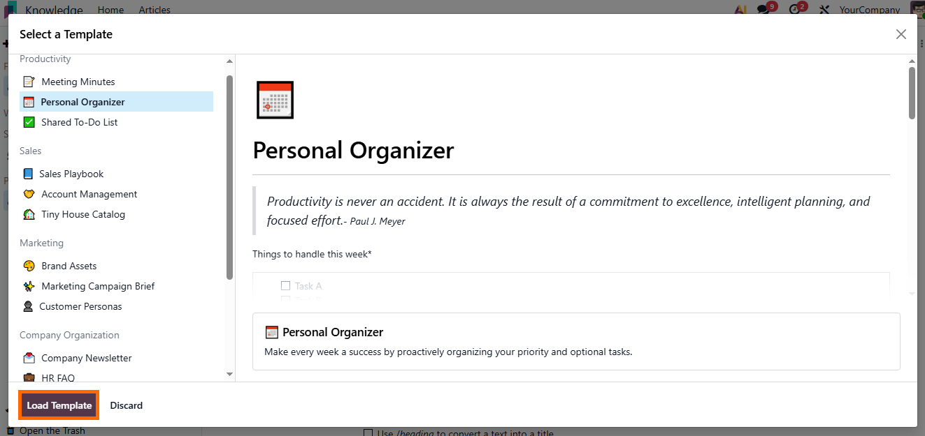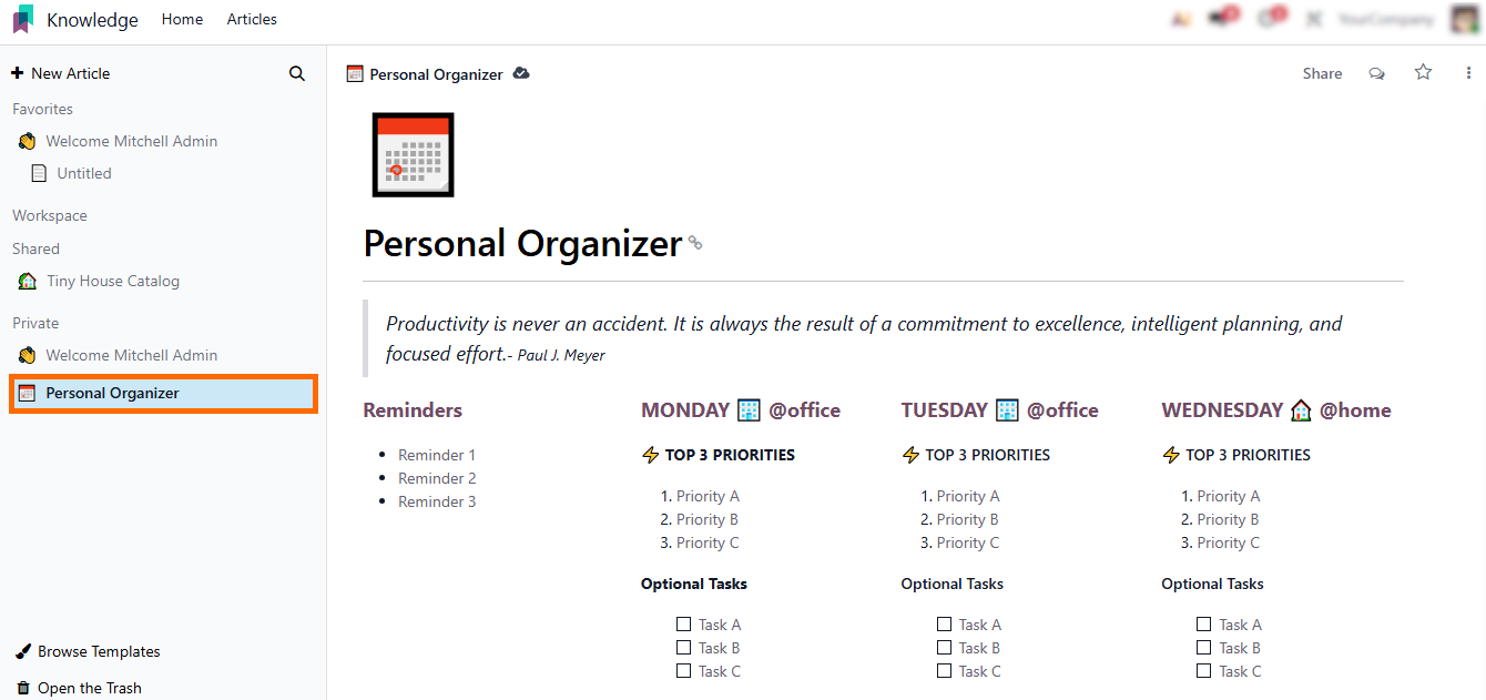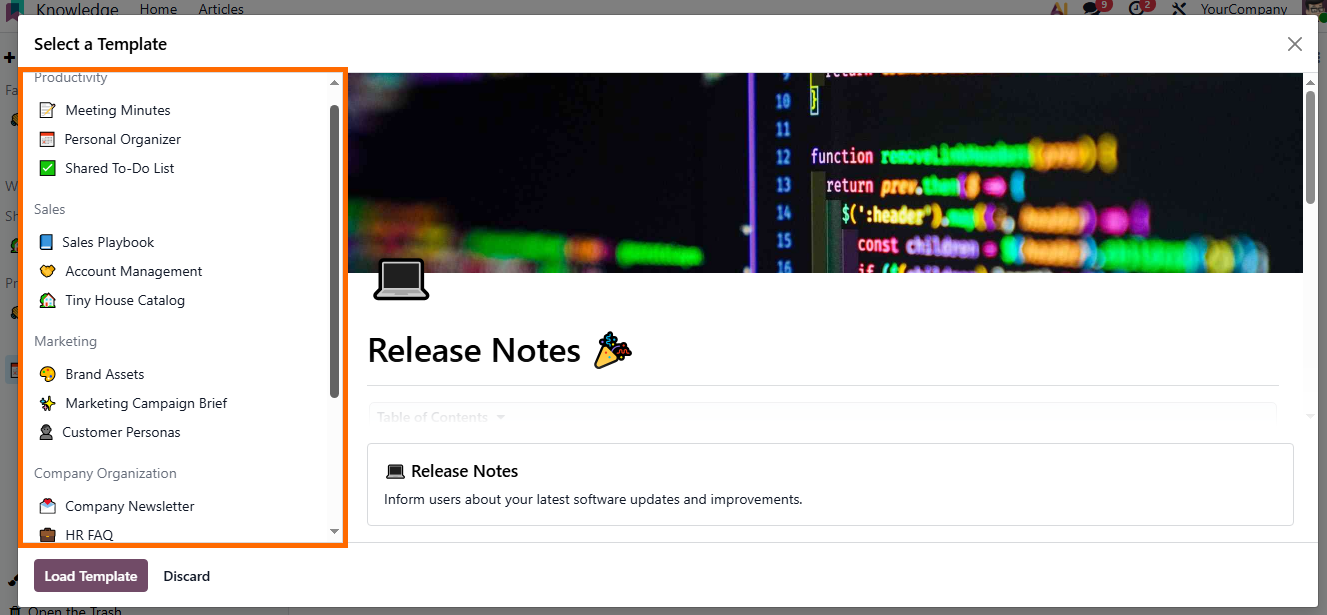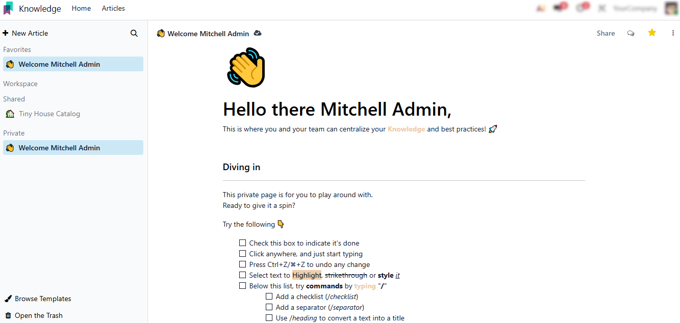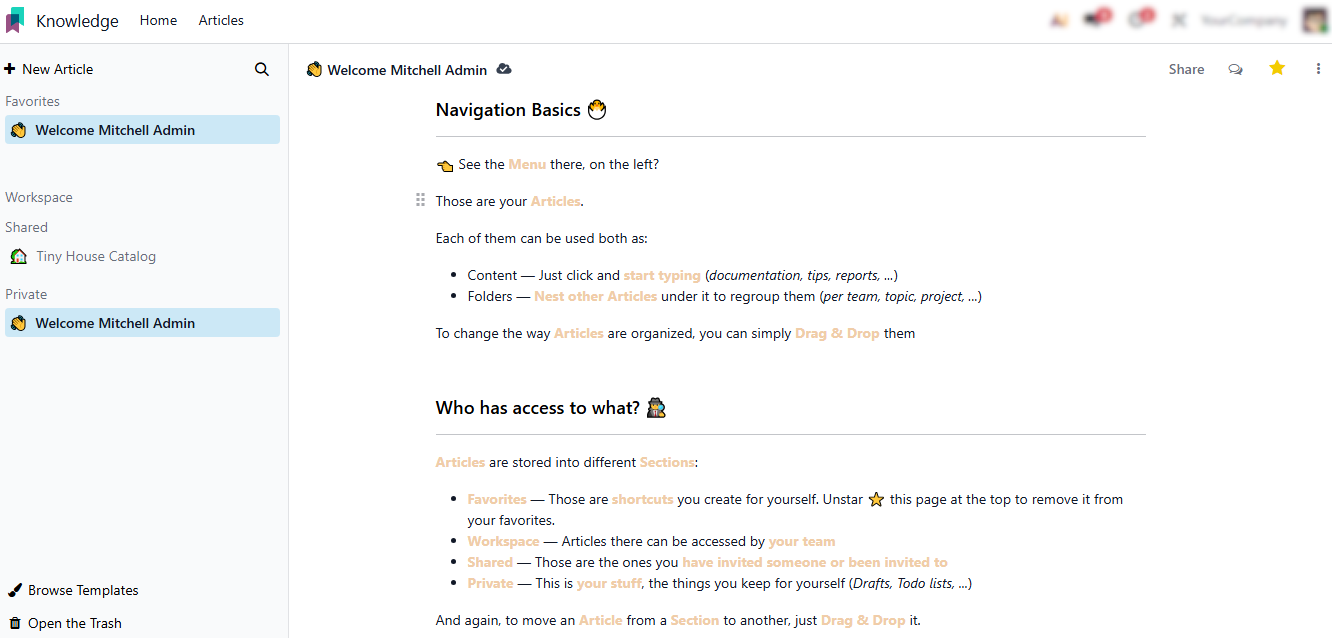 Odoo help provides a practical way to create structured pages instantly through its Browse Templates feature. Instead of designing layouts from scratch, users can rely on predefined templates included in the knowledge base software open source. These templates help teams maintain a consistent style and structure across their internal documentation, tutorials, or project notes for any app knowledge base. Each template in the Knowledge app is optimized for specific use cases – from onboarding guides to product documentation – making it one of the best app for knowledge base management in modern ERP systems. This flexibility makes Odoo one of the best apps for knowledge base creation, offering both open source customization and deep integration within the Odoo library management system.