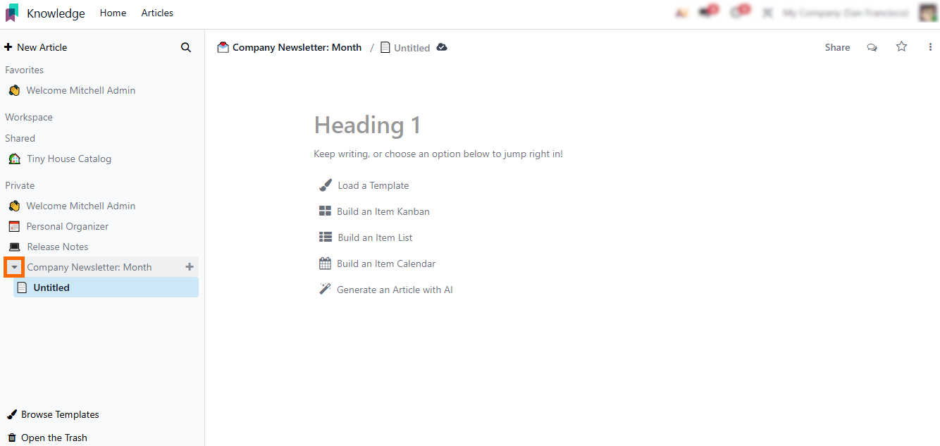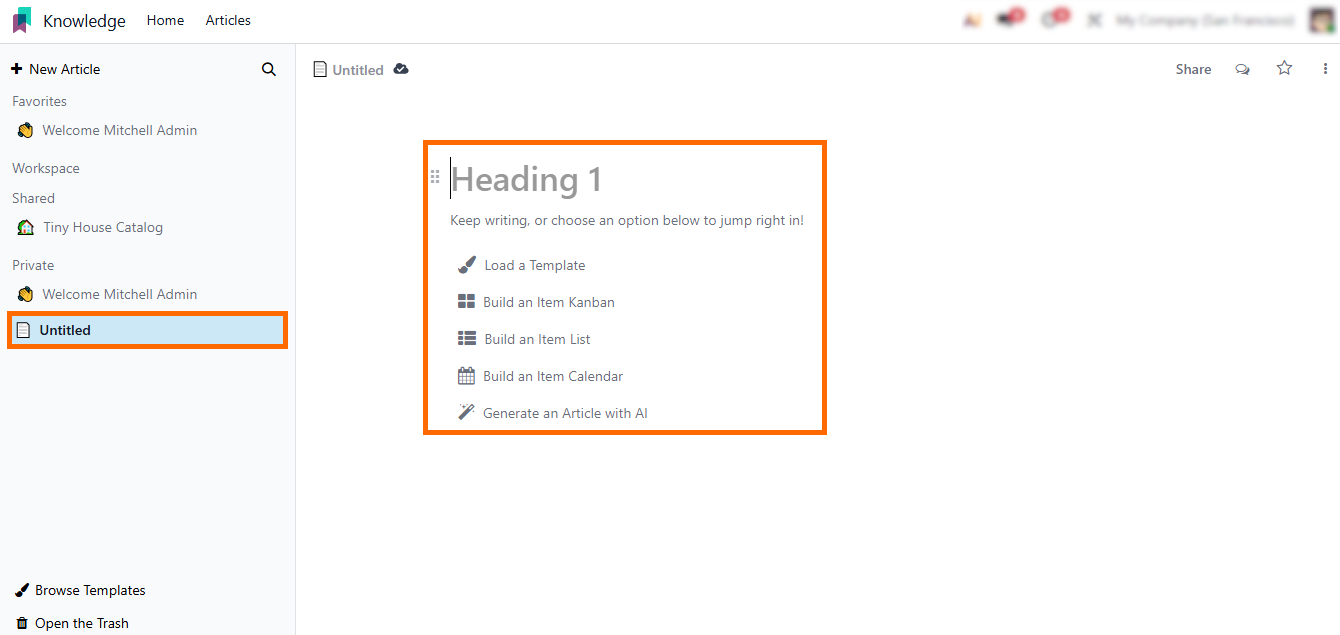 Creating a new article in the Odoo Knowledge App is the first step to build a structured app knowledge base within your company. In this open source knowledge base software, users can easily add, organize, and share internal content directly inside Odoo. Each article functions as a self-contained document, making it ideal for process documentation, ERP manuals, and project wikis. Through the Odoo help, users can create a new page with just one click, assign it to a workspace, and instantly make it visible to their teams. As a result, Odoo becomes both a knowledge management system and a collaborative platform for real-time updates.