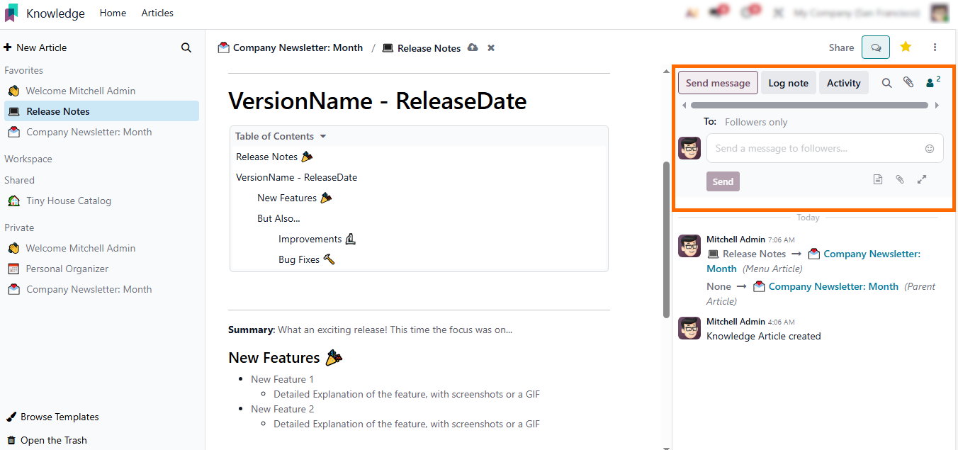 - Plan activities, communicate directly in the system, and use all collaboration tools. Odoo Help supports real-time teamwork — from discussions to shared tasks — keeping your knowledge app interactive and your team aligned.