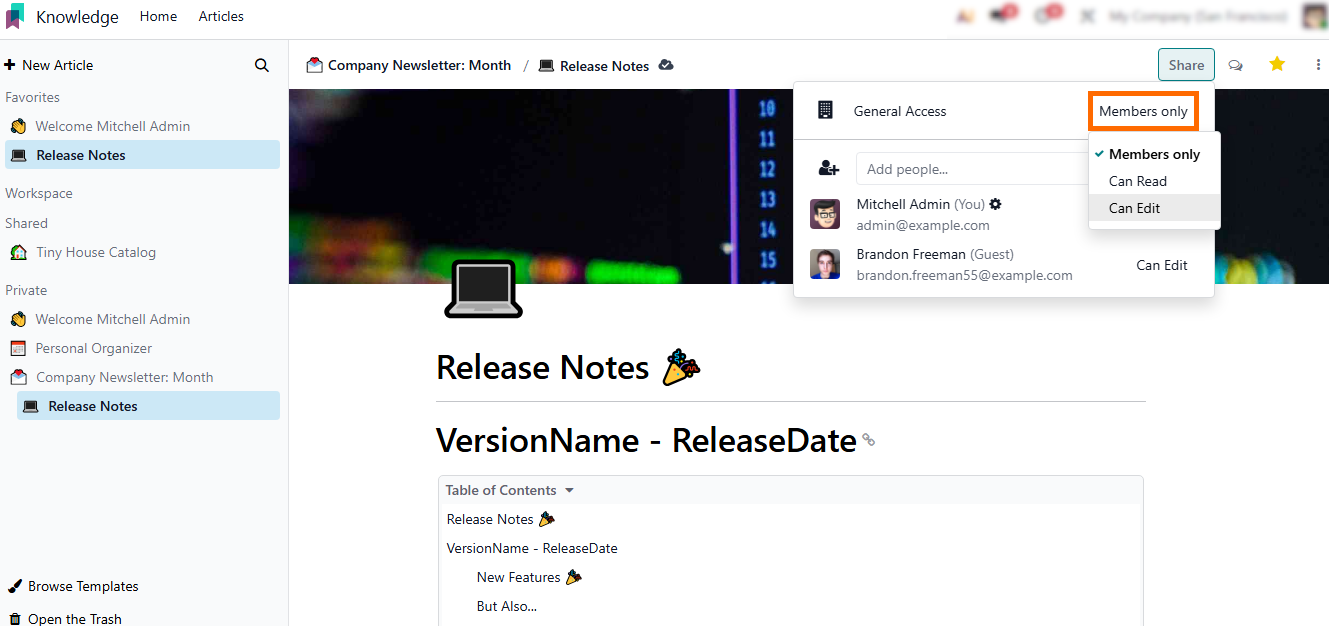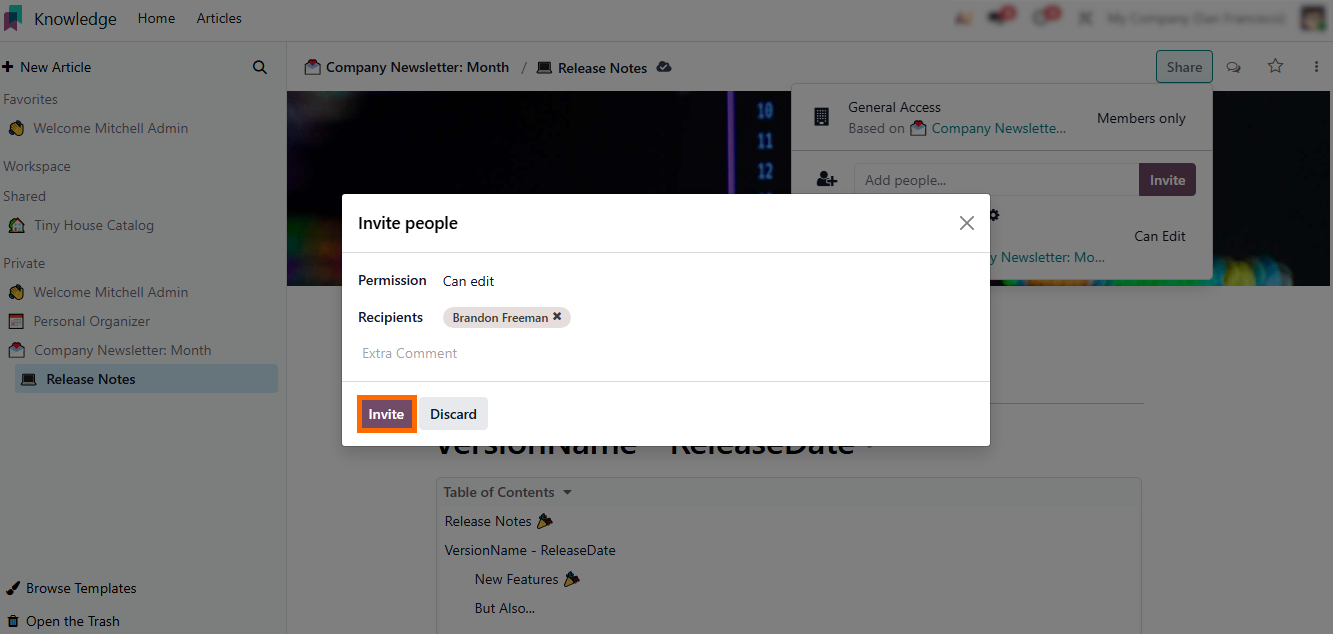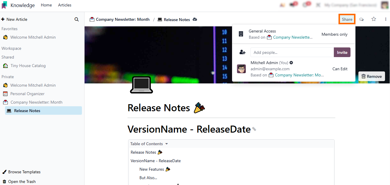 - To share your workspace with other team members, click “Share”. A dialog window will open, allowing you to specify individual access rights and manage who can contribute to your Odoo knowledge.