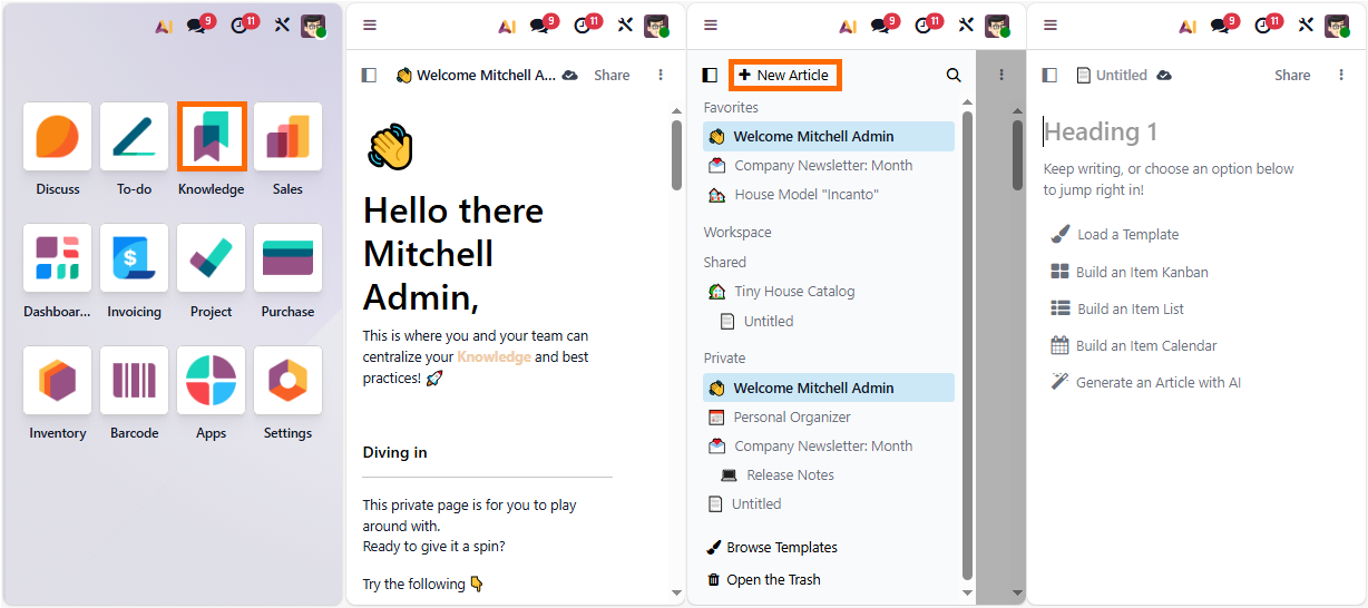 - With the navigation panel in the Knowledge module, users quickly grasp each feature’s purpose. The built-in Odoo help enhances visibility and speeds up learning.