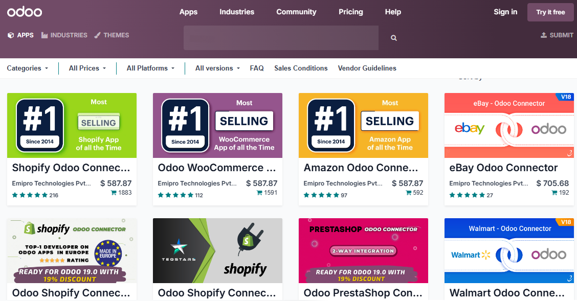 - Additionally, Shopify, WooCommerce, and eBay connectors are also available in the Odoo App Store. Installing these Odoo connectors lets you sync products, inventory, pricing, and orders, centralizing multi-channel operations.