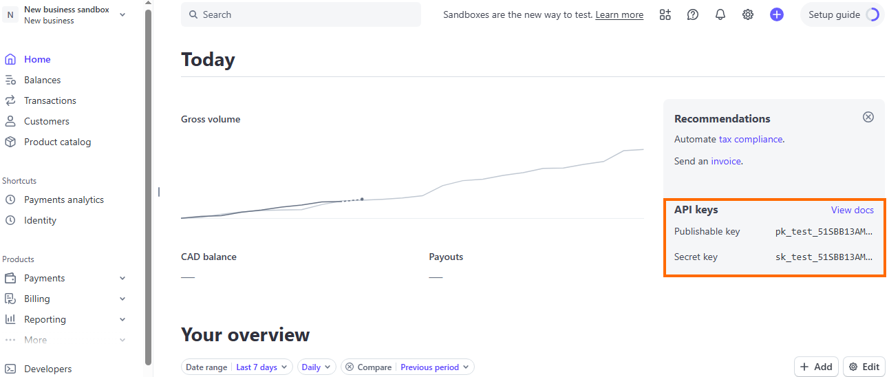 - To locate the Publishable Key and Secret Key for Stripe, log in to your Stripe account. On the dashboard home screen, both keys are listed—simply copy and paste them into the Odoo Stripe settings.