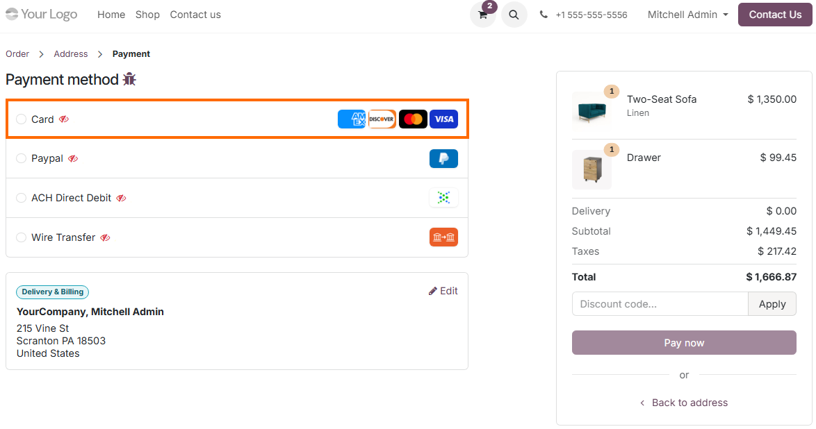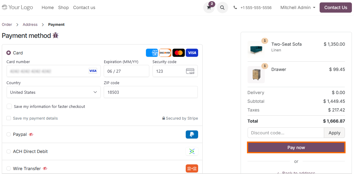 - Since Odoo payment providers were already configured, the system also displays the available payment methods, such as Stripe, PayPal, or any others you’ve enabled.