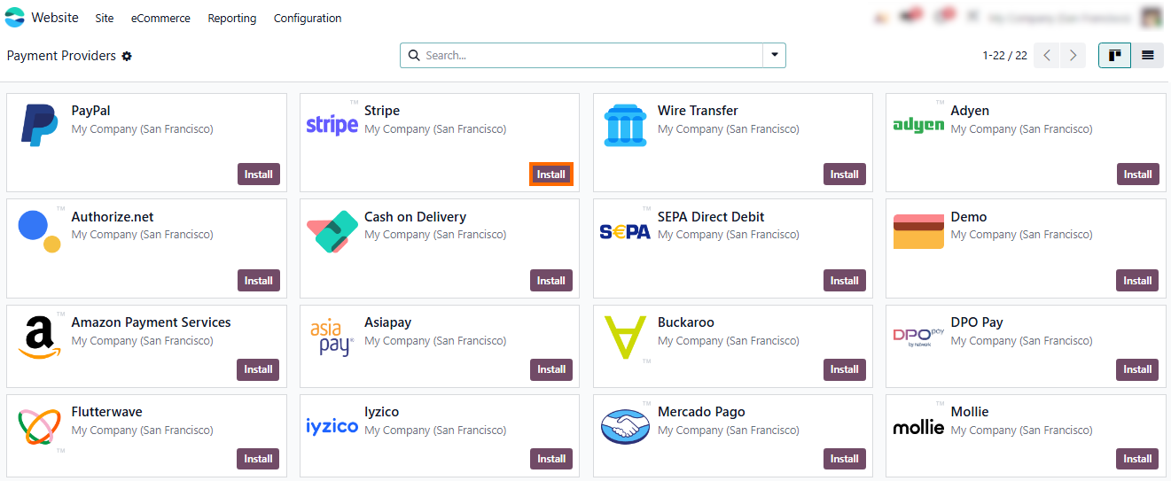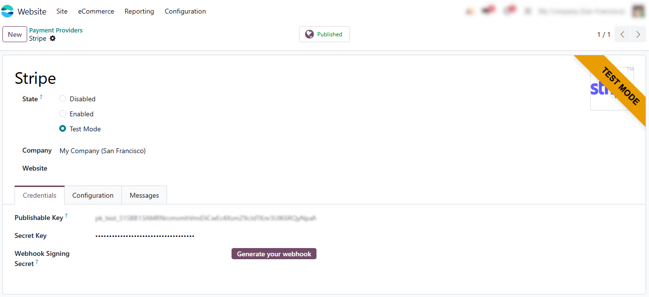 - Odoo 19 lists all available gateways, including Stripe, PayPal, Adyen, and others. For example, select Stripe and configure it in the test mode to simulate real transactions without processing actual payments. This demonstrates Odoo credit card processing and secure Odoo payment processing.