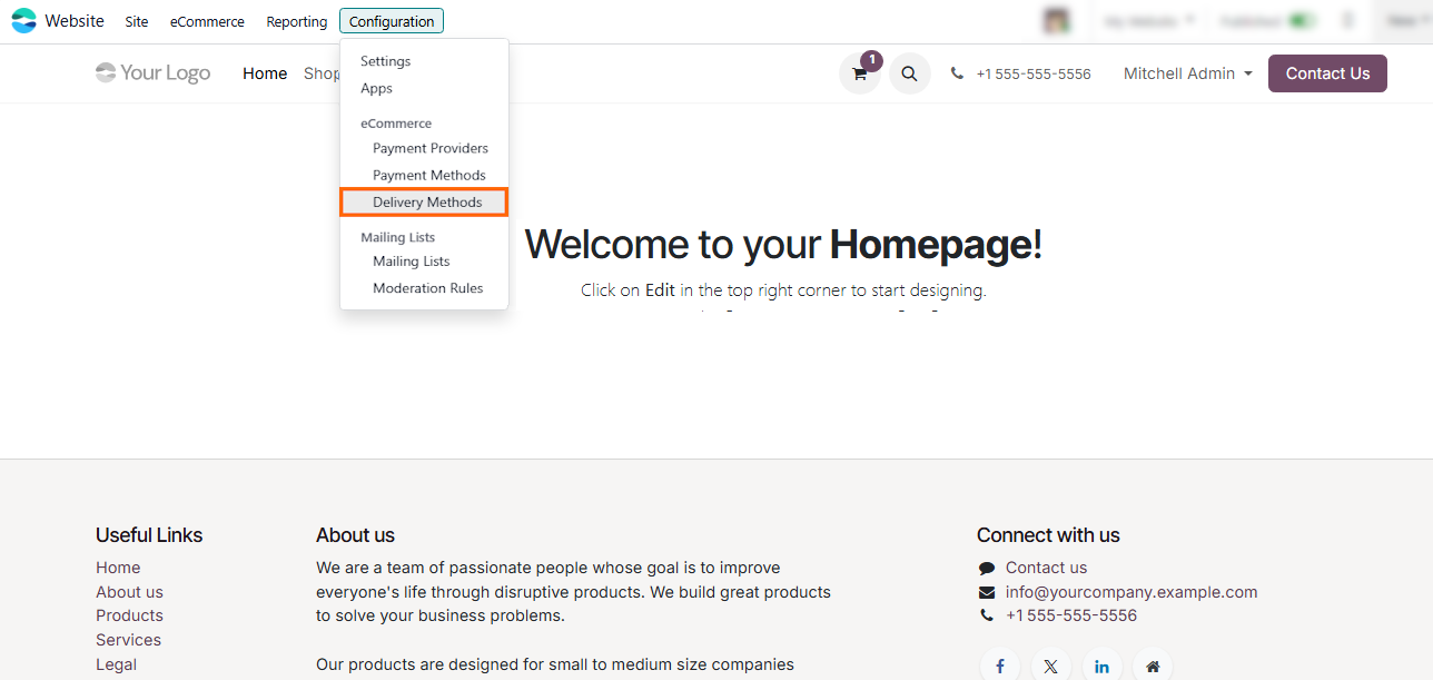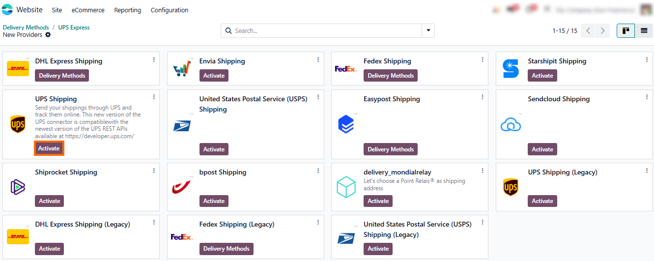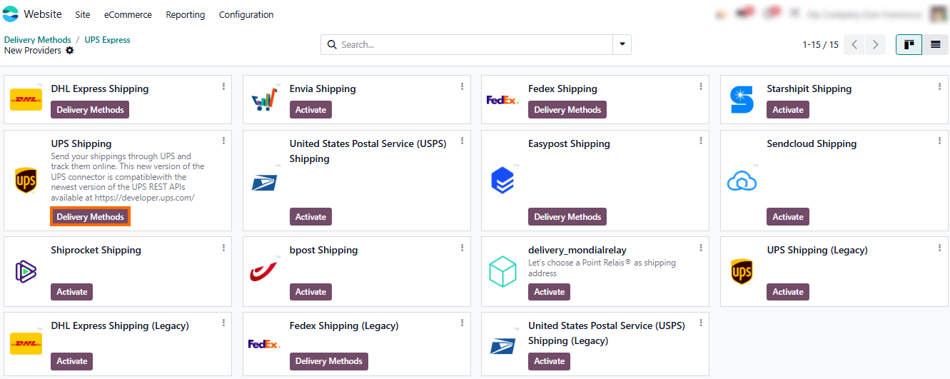 - Go to the Website Module, click on “Configuration” and select “Delivery Methods” to activate or edit providers. Here you can connect Odoo FedEx, UPS, DHL, or USPS depending on your business needs.