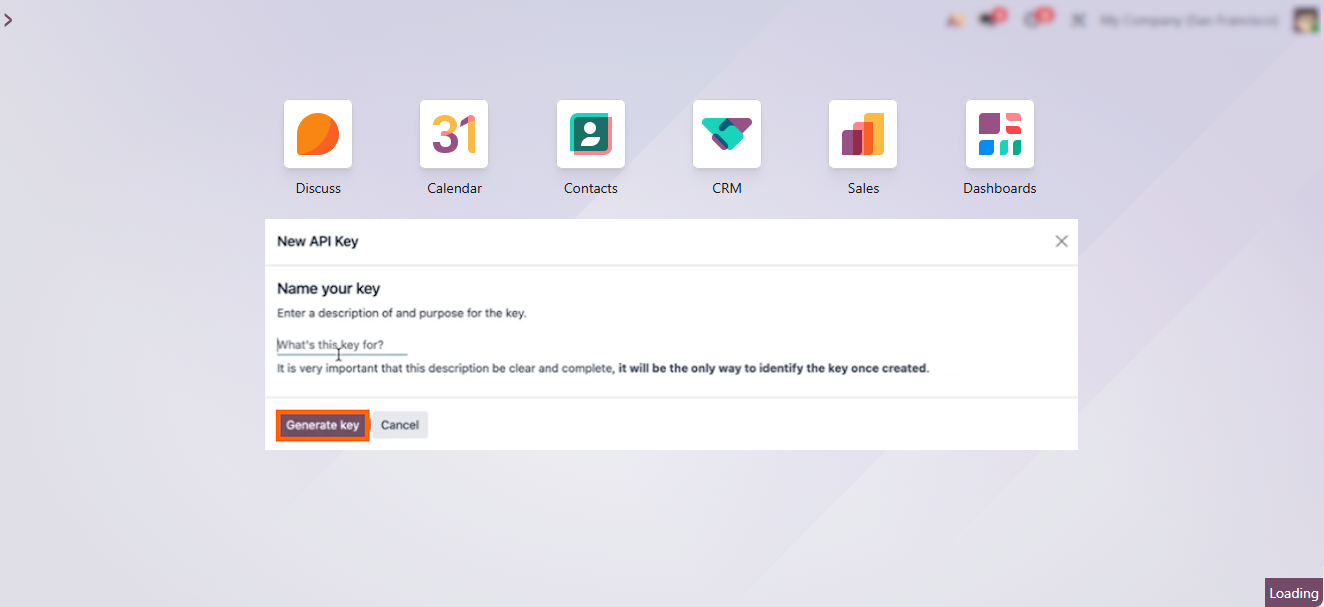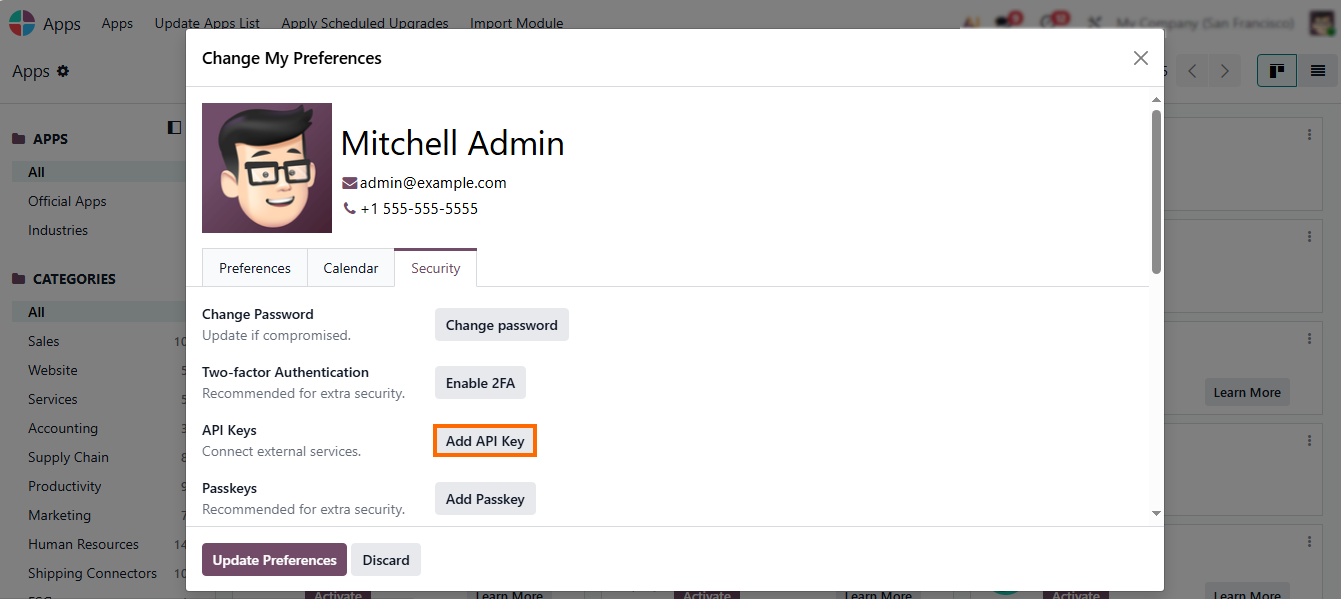 - Go to My Preferences, select the “Security” tab and click” Add API Key” to create a new key for authentication. Here you can generate multiple keys for different purposes