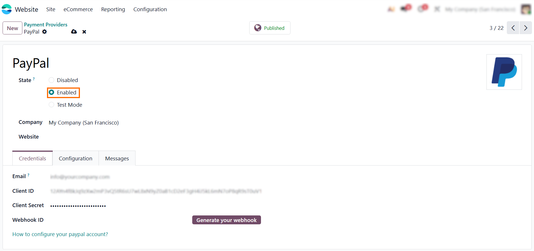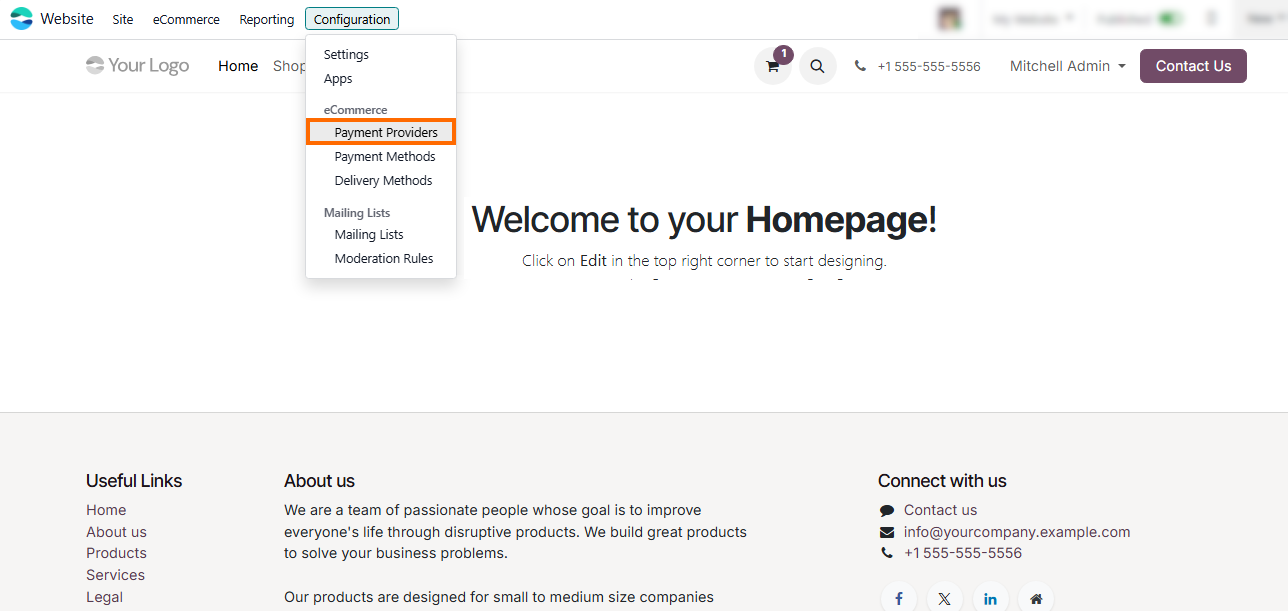 - To configure Odoo payment integration, first activate the providers you plan to use. Go to Configuration in the Website module and select the Odoo payment gateway options. This step initiates the connection of your system to online payment methods.
