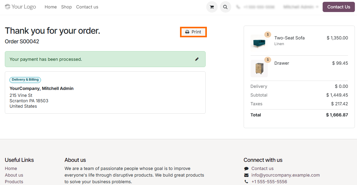 - After successful Odoo payment, the system shows a confirmation message: “Thank you for your order.” At the same time, the system generates an official order number, which can also be printed by clicking Print.