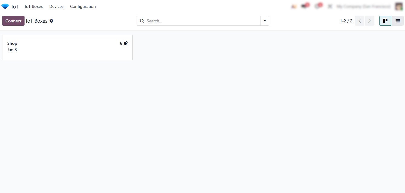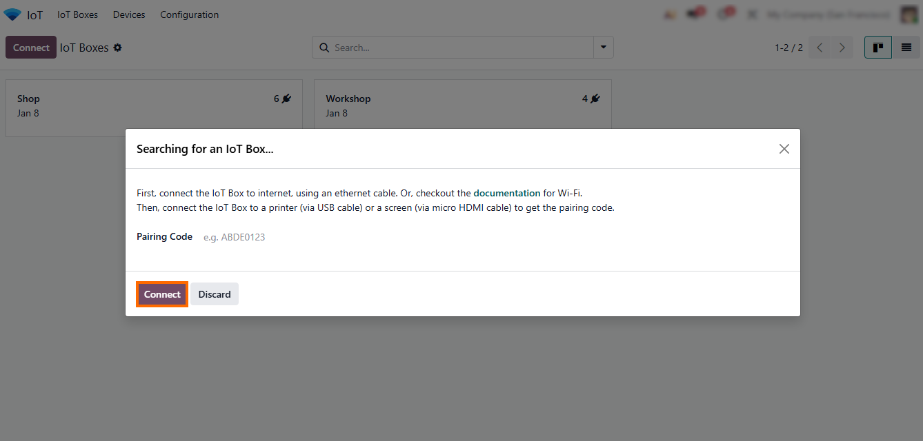 - After activation, proceed to the main device configuration by clicking the “Connect” button in the IoT Boxes interface. This opens the setup wizard where devices can be registered, tested, and linked to specific workflows.