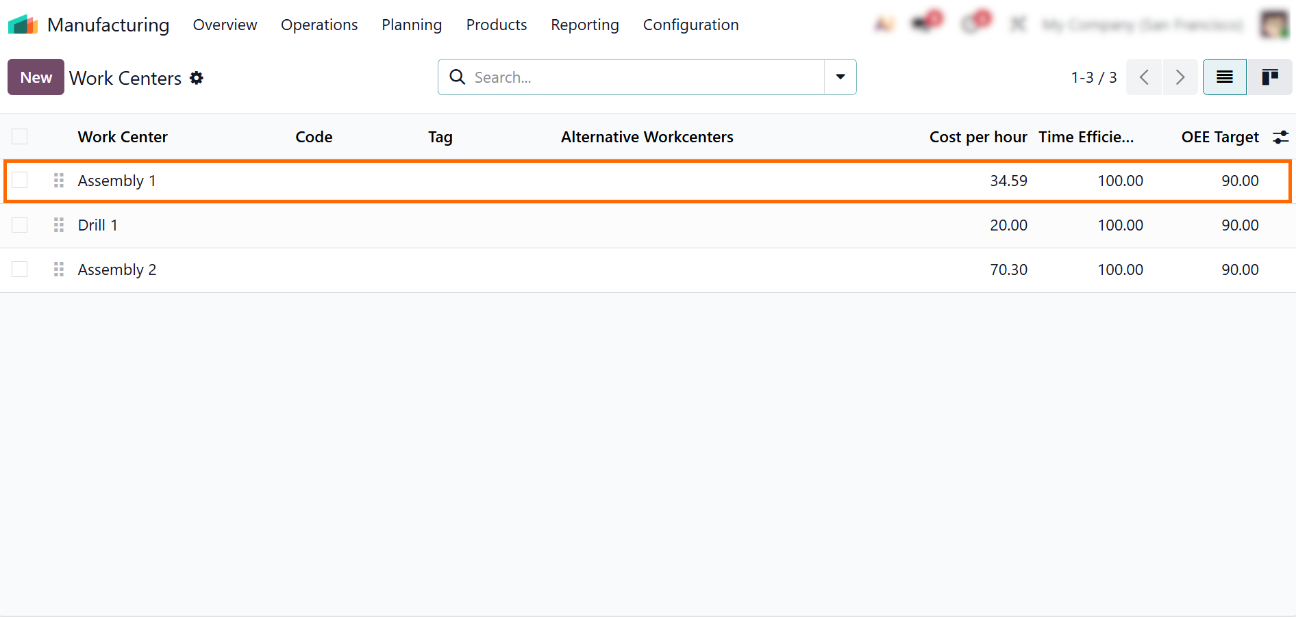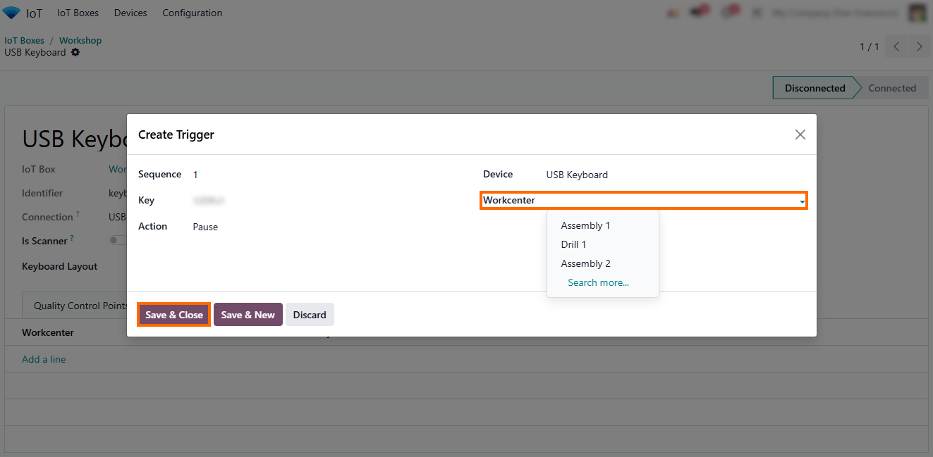 - Select the relevant work center and review its operational settings, including capacity, working hours, and connected devices, to ensure that IoT actions are applied to the correct production stage.
