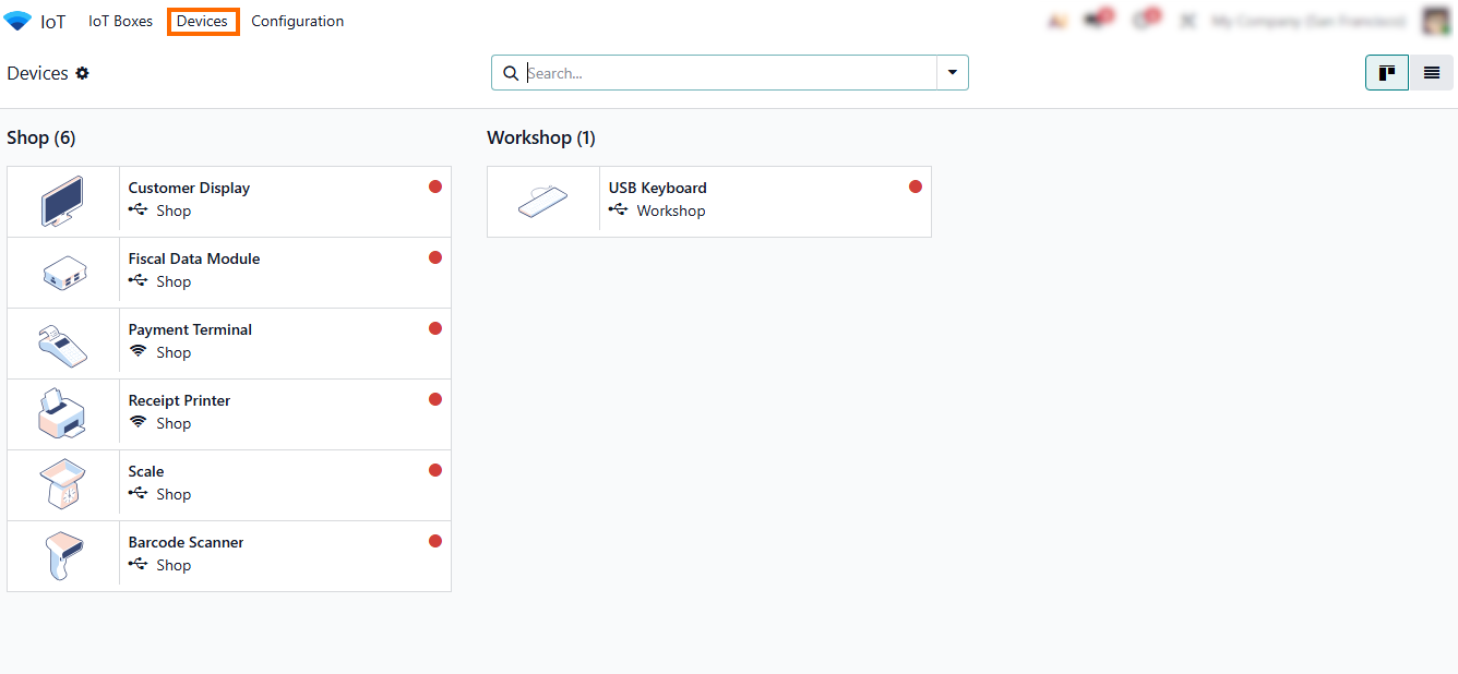 - The connected device is now listed as “Workshop”. This confirms that the pairing process with the Odoo IoT Box was successful and the device is ready for configuration.