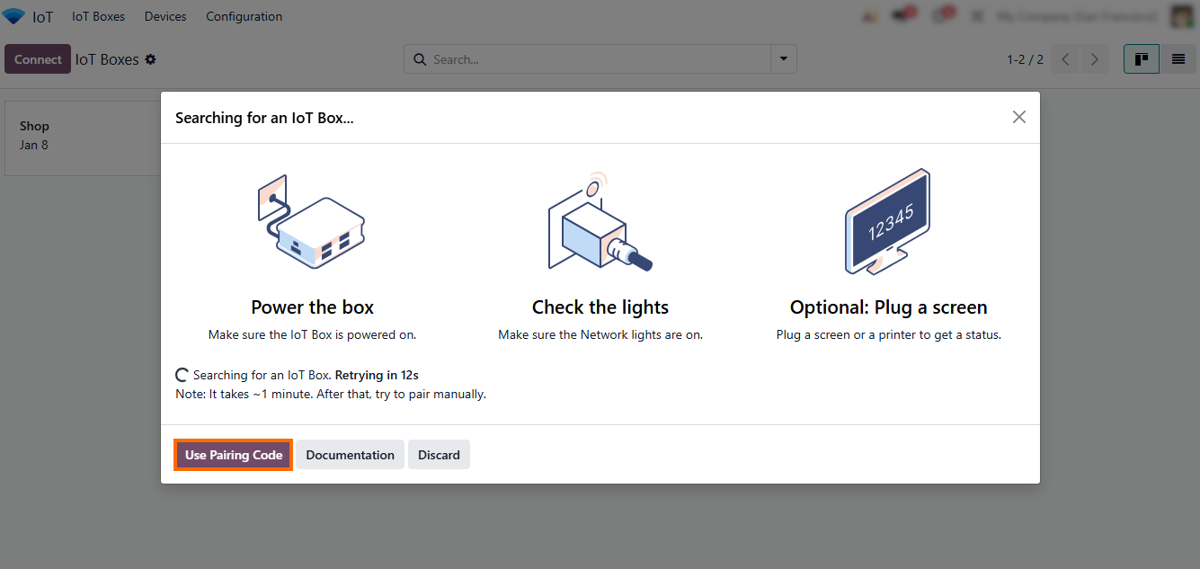 - Click “Connect” to add a new device and wait for the system to automatically start searching for an IoT Box. Alternatively, click “Use Pairing Code” to manually link a device by entering its unique code.