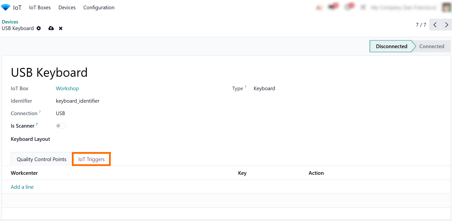 - Click “IoT Triggers” to configure actions for the device. Define which Odoo workflows are triggered by events like button presses, scans, or scale measurements.