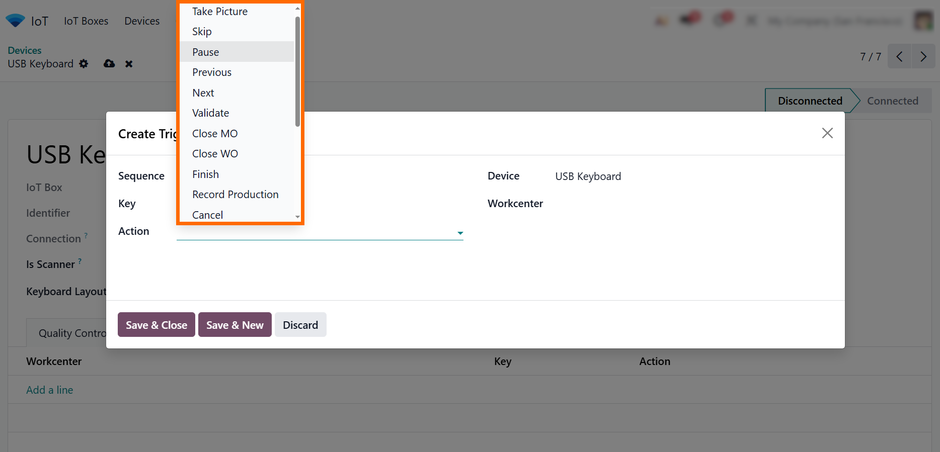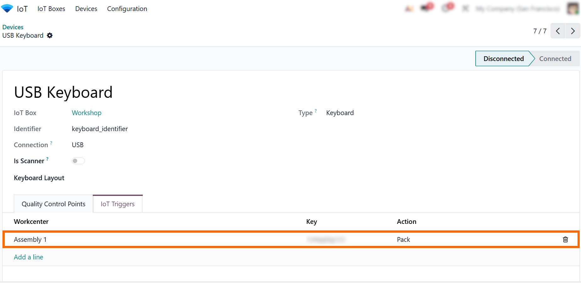 - Use the “IoT Triggers” tab to assign connected hardware from the IoT in a Box – “My Devices” list and define which device events should trigger actions within the selected production workflow.