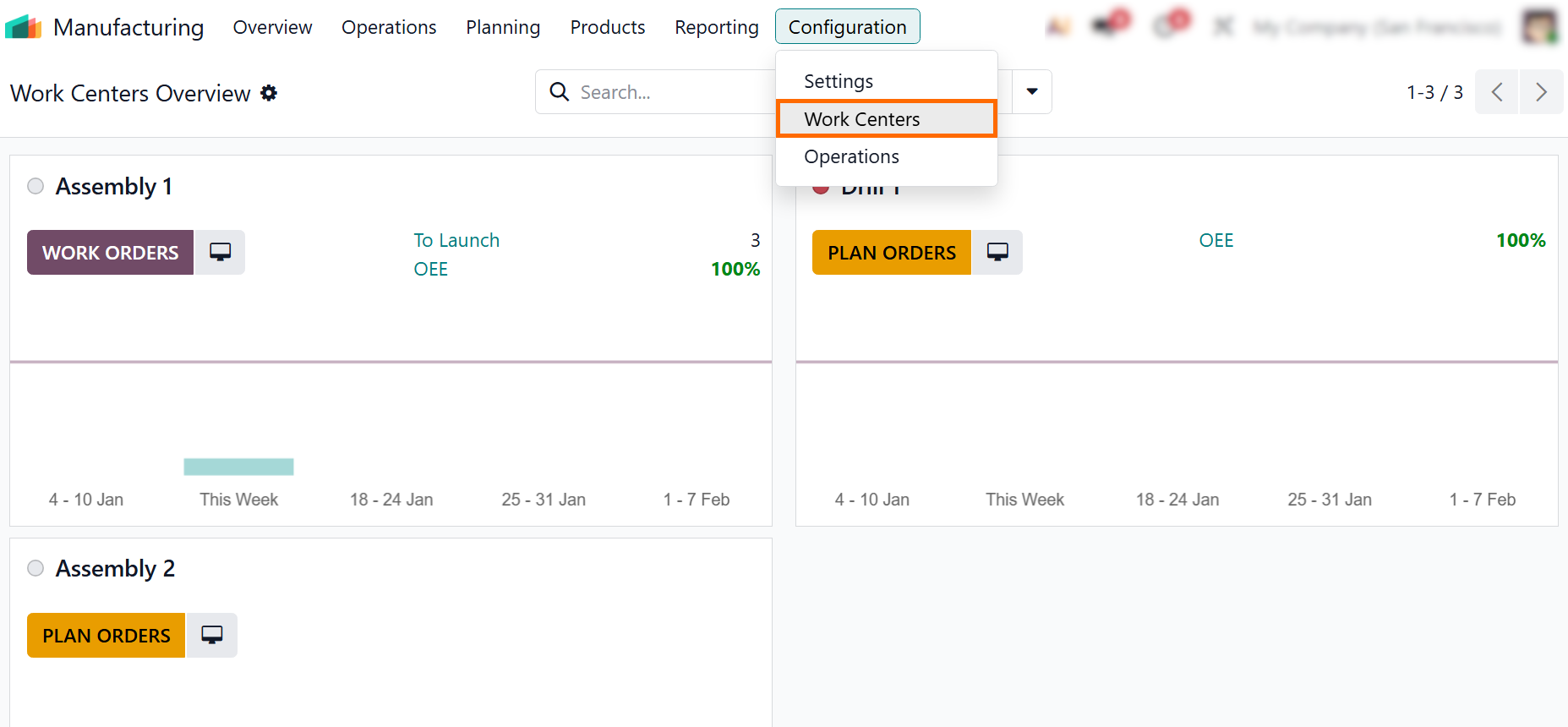 - To link a device to production activities, navigate to “Manufacturing”, open “Configuration”, and select “Work Centers”, then open the required work center.