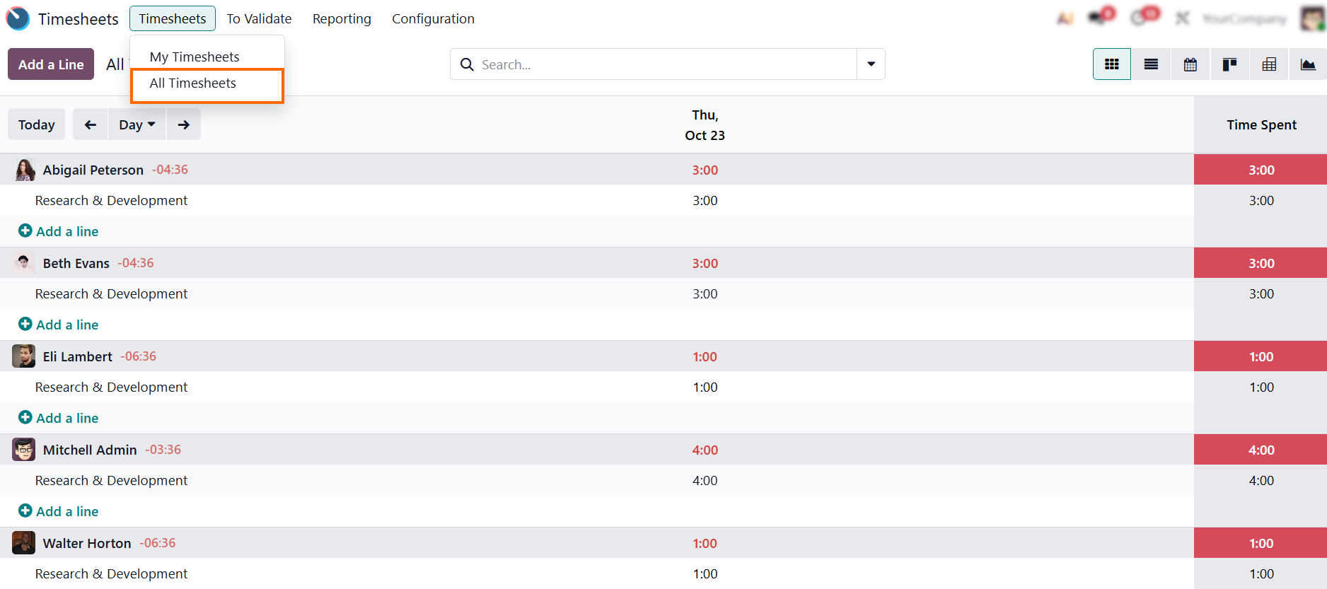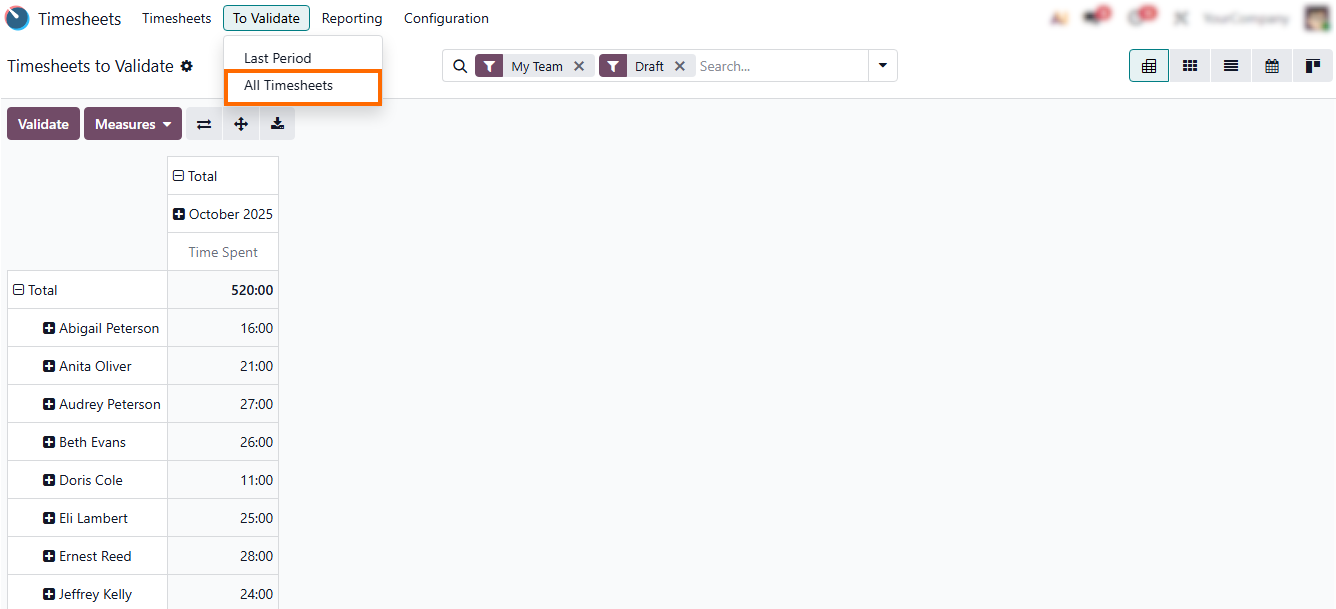 - Click “All Timesheets” in the Odoo Timesheets app to view and validate