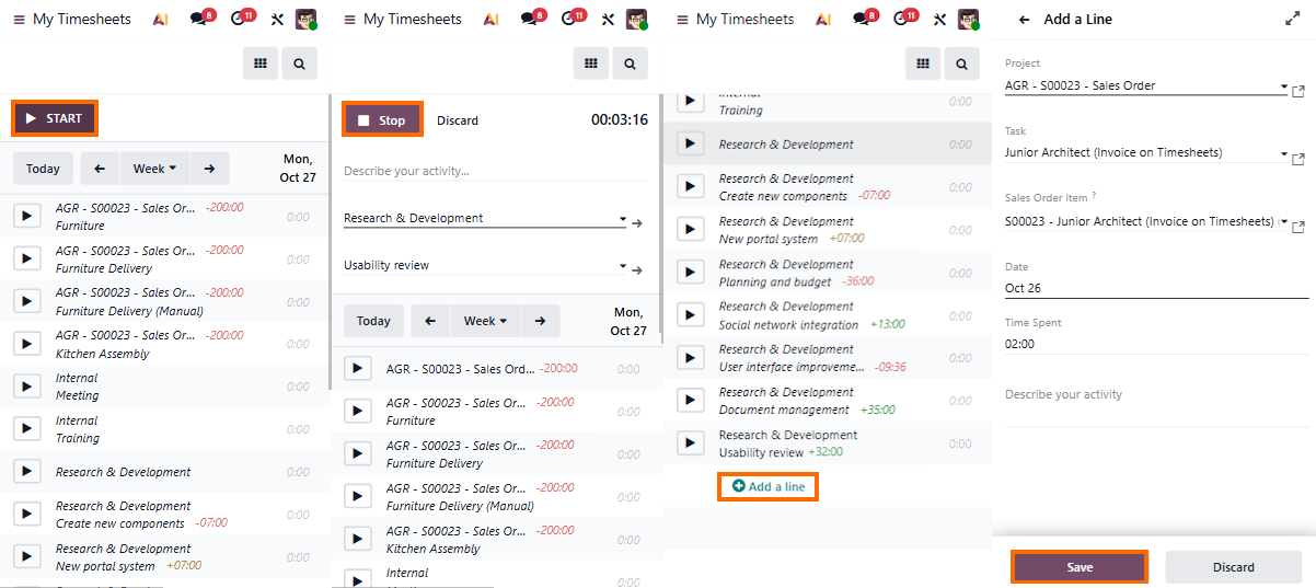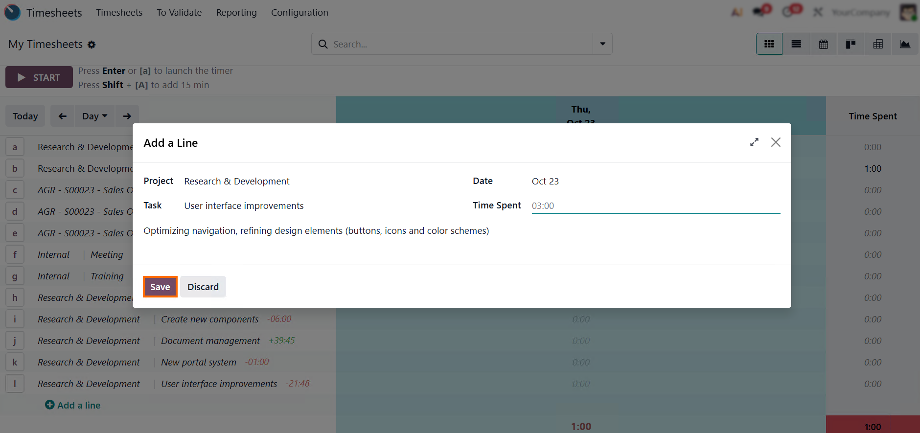 - You can also adjust the date if required, then click “Save” to confirm the entry and keep your timesheet app consistent with the rest of the data in the Odoo time sheet.
