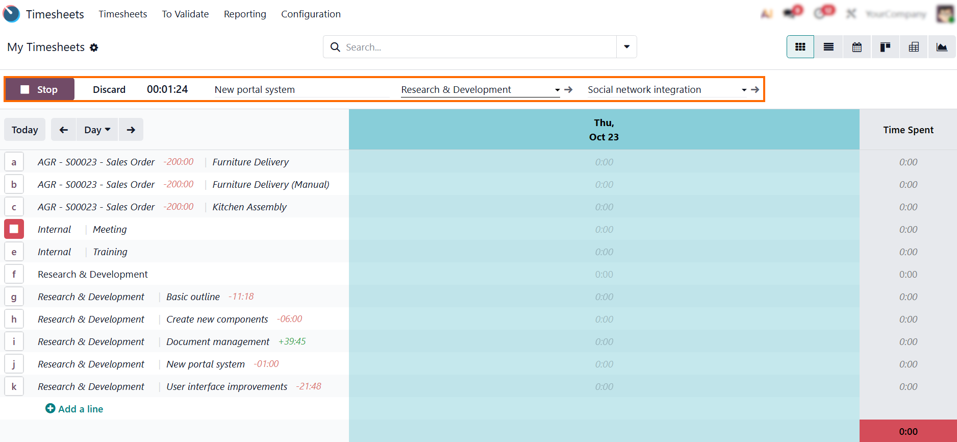 - Once the task is complete, click “Stop”, and your entry in the timesheet app will instantly appear in the list – ready for review, billing, or further editing in timesheet Odoo.