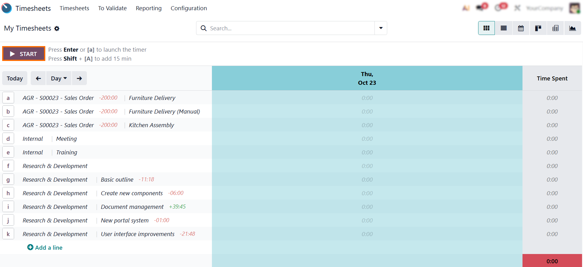 - To start tracking time, simply click “Start”, as shown in the screenshot below, and the time sheet app will immediately begin automatic Odoo time tracking in real time.