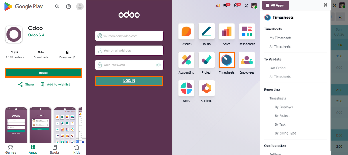 - Install the Odoo timesheet app from Google Play or App Store. Sign in with your company’s Odoo database credentials to start tracking time instantly from your mobile dashboard.