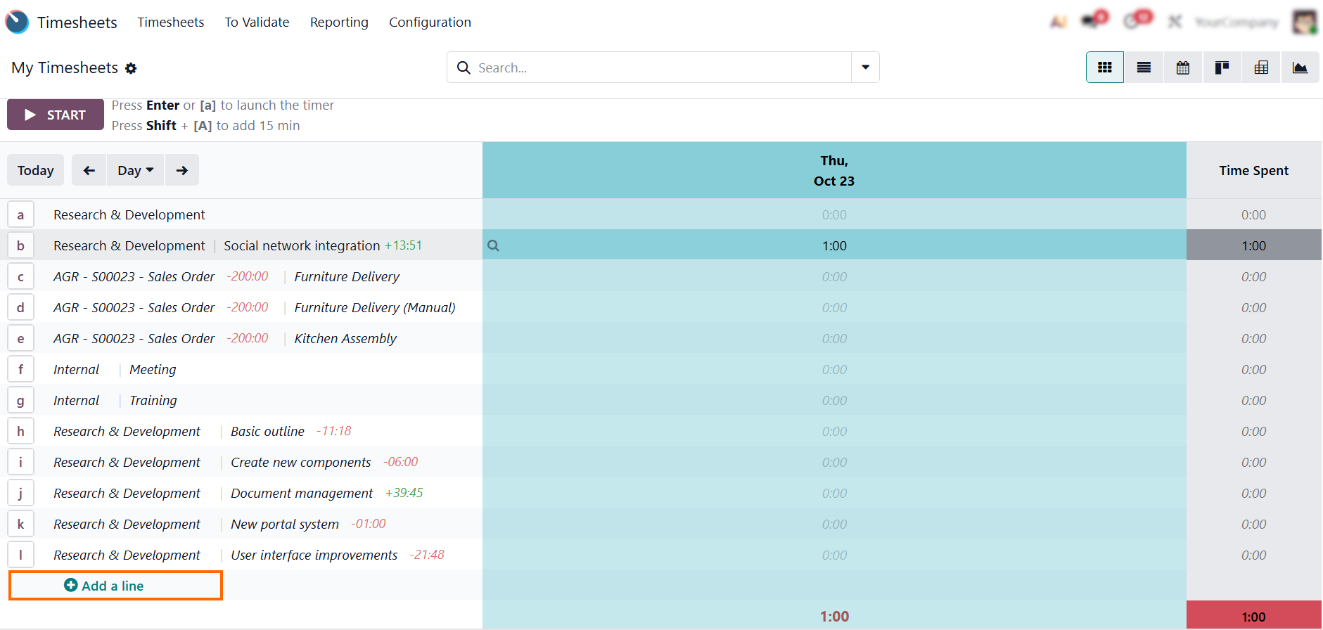 - Click “Add a Line” to manually record completed work in your time sheets app. This ensures offline and untracked activities are accurately recorded in your total workload.