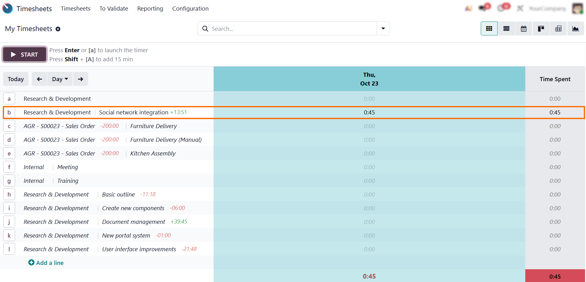 Before exploring all the powerful features Odoo Timesheets has to offer, you need to make sure the Odoo timesheet app is properly activated. This first step is quick but essential — it unlocks the Odoo time tracking environment and connects it with other Odoo apps such as Projects, Planning, and HR. Once activated, users can immediately start logging hours, managing tasks, and analyzing productivity right from their dashboards. This simple setup lays the foundation for a fully connected workflow – where every tracked minute contributes to smarter resource planning, accurate billing, and transparent project performance.