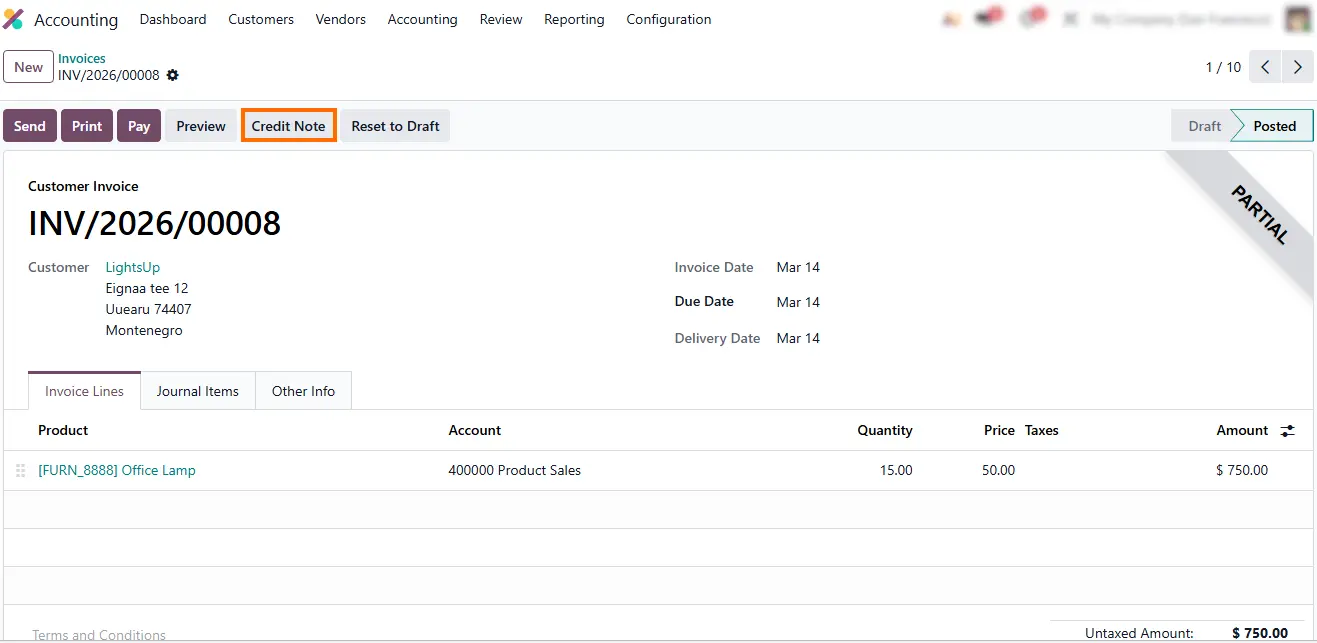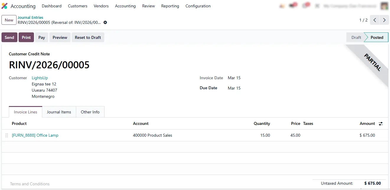 - Click “Credit Note” to initiate the reversal. This action applies storno accounting in Odoo and generates a red storno entry, immediately offsetting the original posting while preserving full visibility in the ledger.