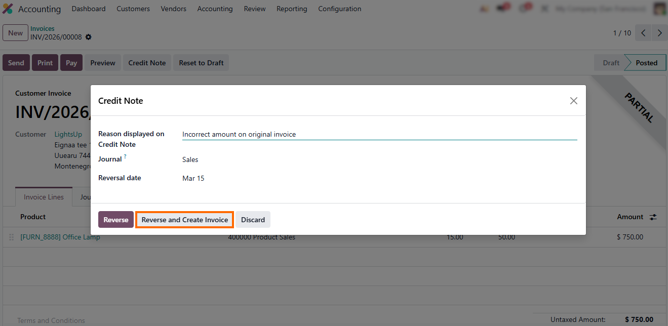 - Make any necessary adjustments to the Credit Note, then click “Reverse” or “Reverse and Create Invoice” to complete the storno accounting process, ensuring audit trails, expense accuracy, and tax compliance.