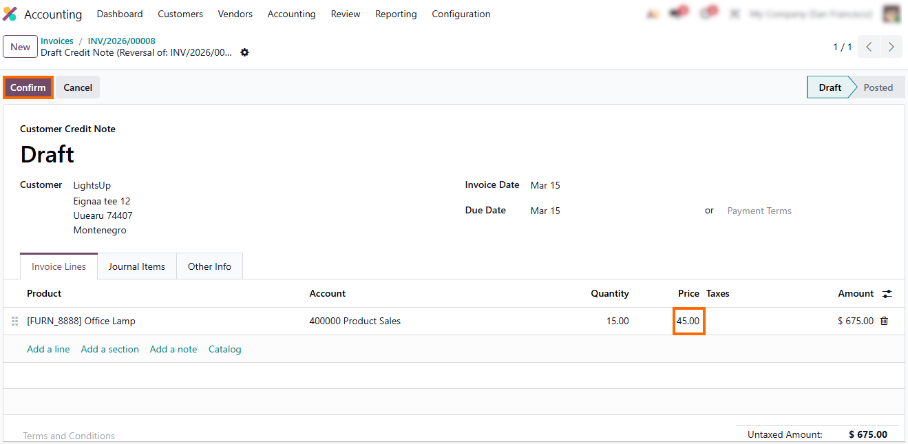 - Adjust the draft Credit Note as needed, ensuring the correction accurately reflects the intended financial outcome, then click “Confirm”.