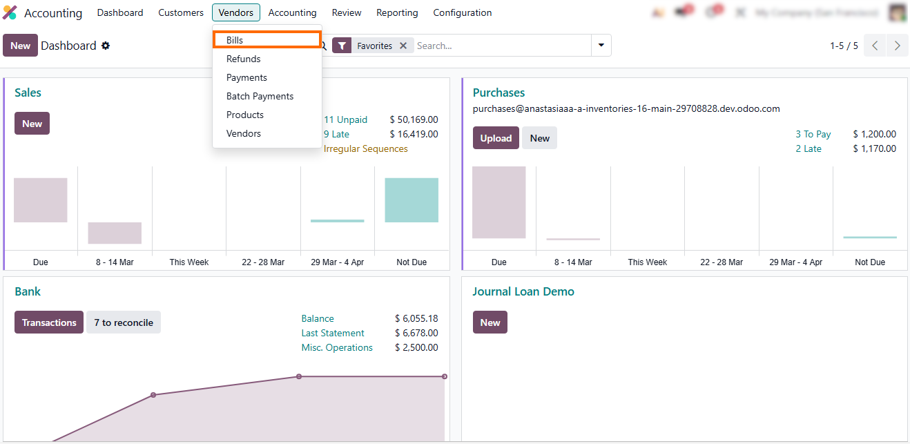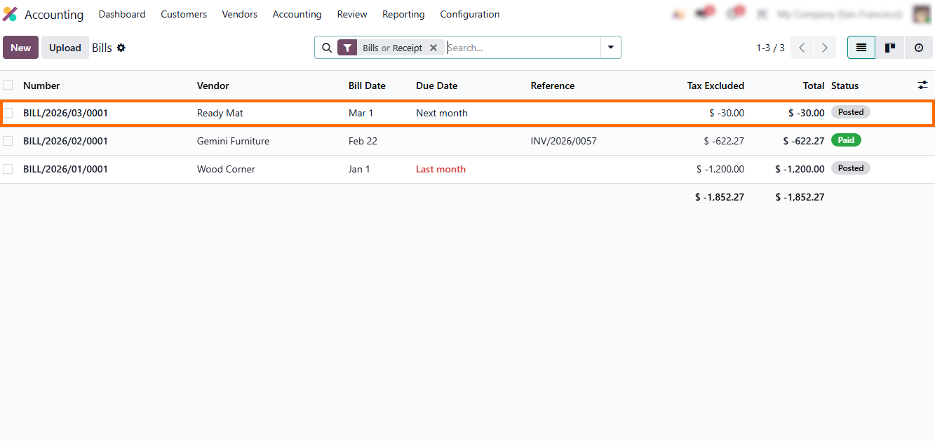 - Open the Accounting module in Odoo 19, then navigate to Vendor Bills. This ensures that all posted bills are visible and ready for controlled correction.