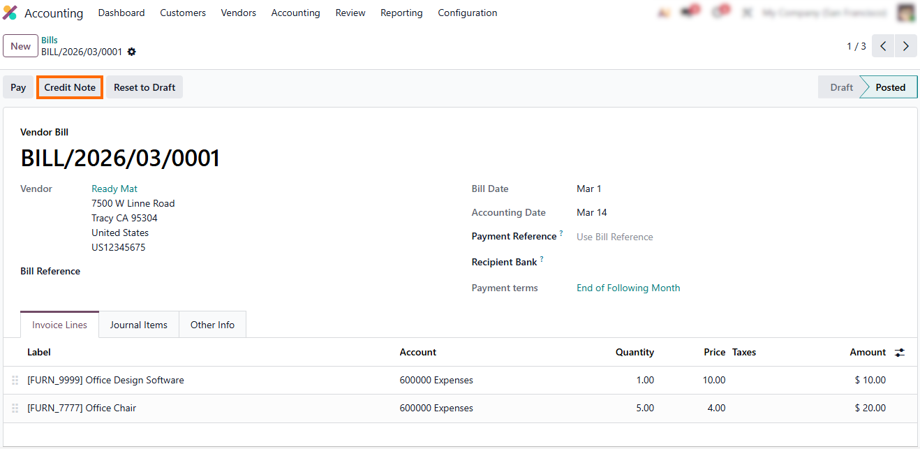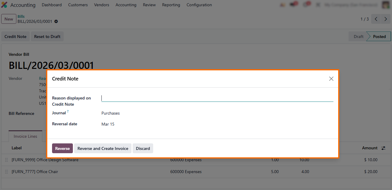 In storno accounting in Odoo 19, correcting vendor bills follows the same controlled logic as customer invoices. This confirms that storno accounting is not limited to sales transactions. Once posted, a vendor bill affects expenses, taxes, and accounts payable, making direct edits impossible. Instead, storno accounting Odoo requires a structured reversal that preserves the original posting, and errors are corrected via a Credit Note, creating a red storno entry. This controlled approach enforces compliance with accounting standards while keeping historical data intact, and it applies uniformly across all users and journals, demonstrating how storno accounting in Odoo works in practice and providing a clear answer to what is storno in accounts payable workflows.