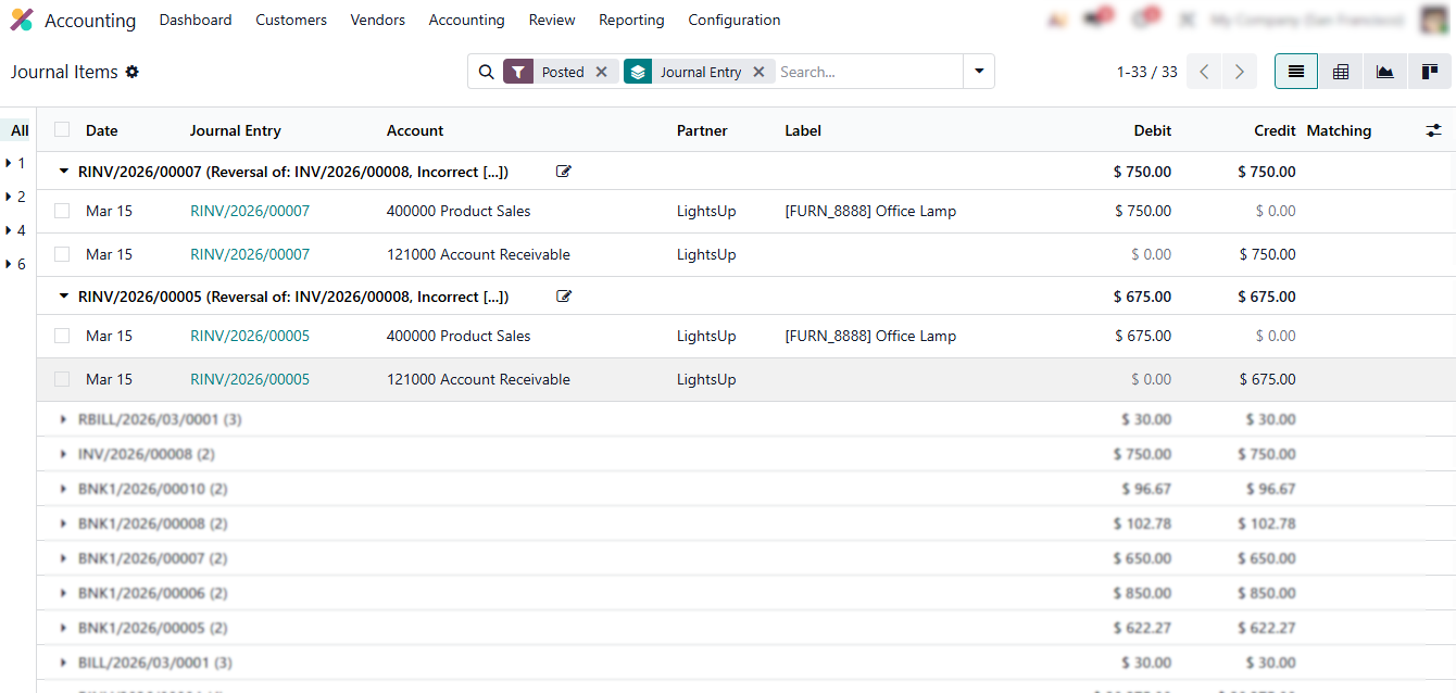 - Check the journal entries. The original invoice and the Credit Note are linked in the ledger, showing a clear correction history and demonstrating how storno accounting in Odoo 19 enforces controlled, auditable reversals.