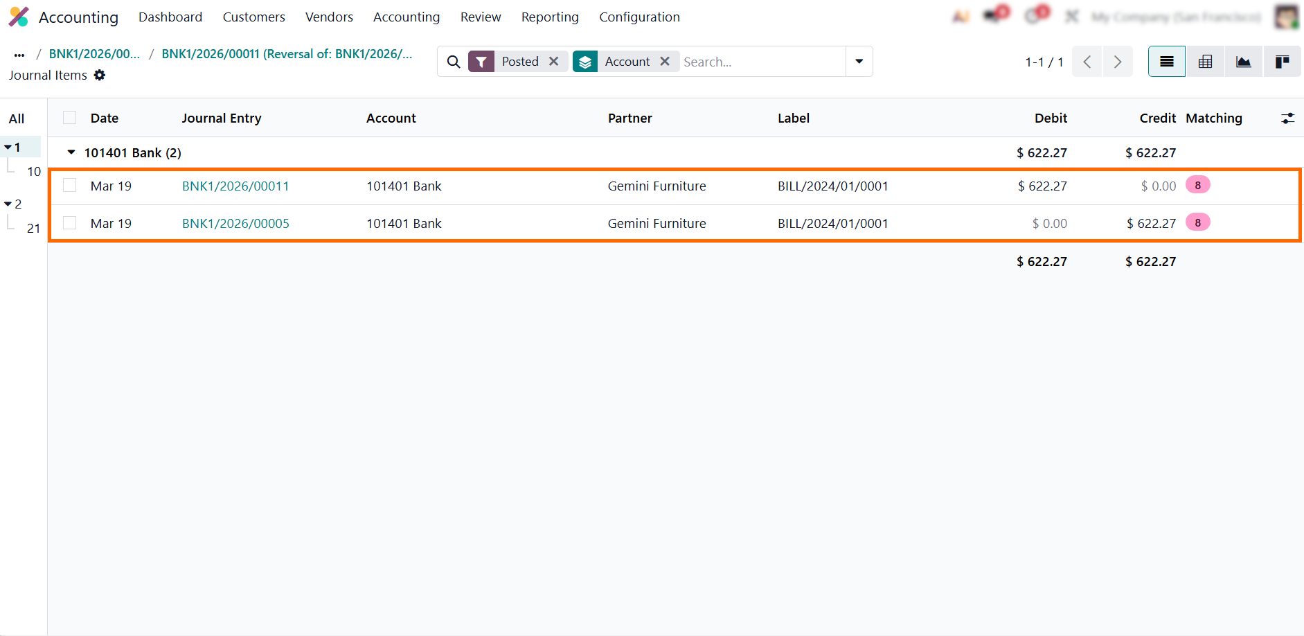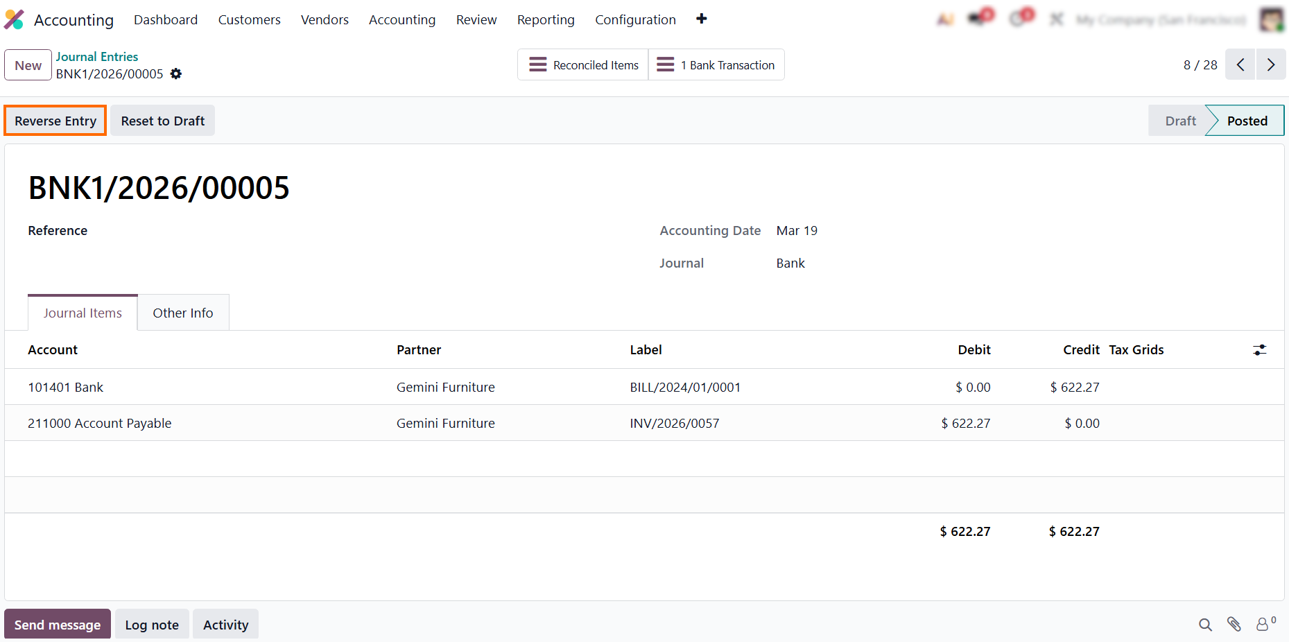 and the journal and click “Reverse”. The system creates a reversing entry with
