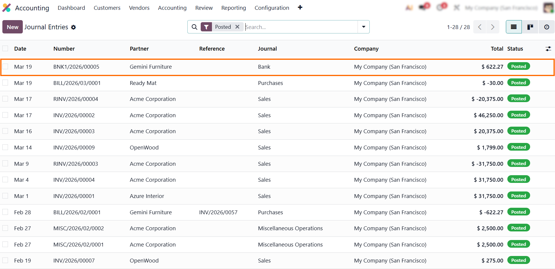 - Return to the Accounting module and navigate to Journal Entries. This displays all posted manual entries eligible for storno accounting.