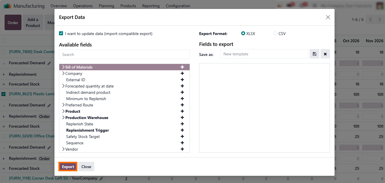 - The “Export” action in the Odoo master production schedule lets planners quickly download a structured master production schedule to share data, document decisions, or present a clear planning example directly from the MPS view.