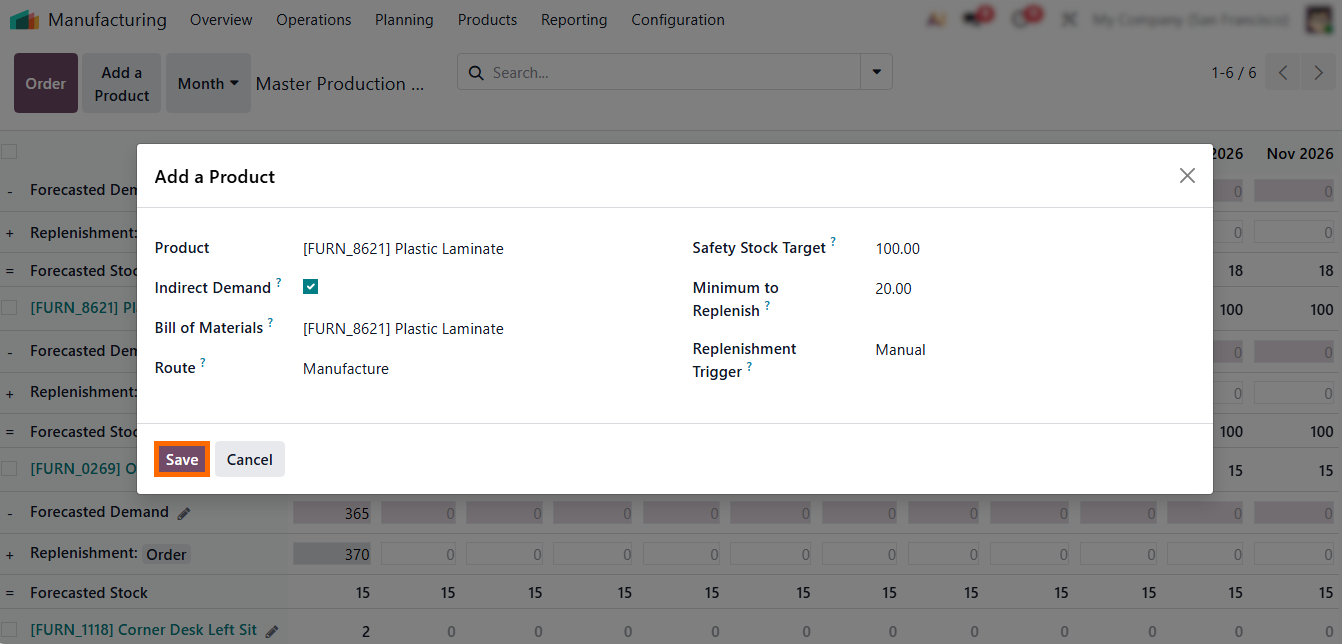 Odoo 19 includes built-in master production schedule templates and options. Users can customize periods, set safety stock, define replenishment rules, and instantly understand how to create a master production schedule using proven planning techniques and automated calculations.
