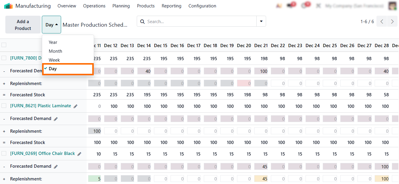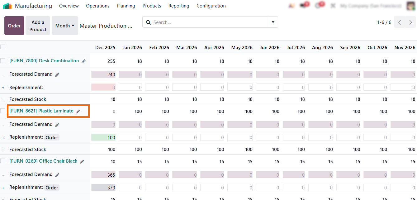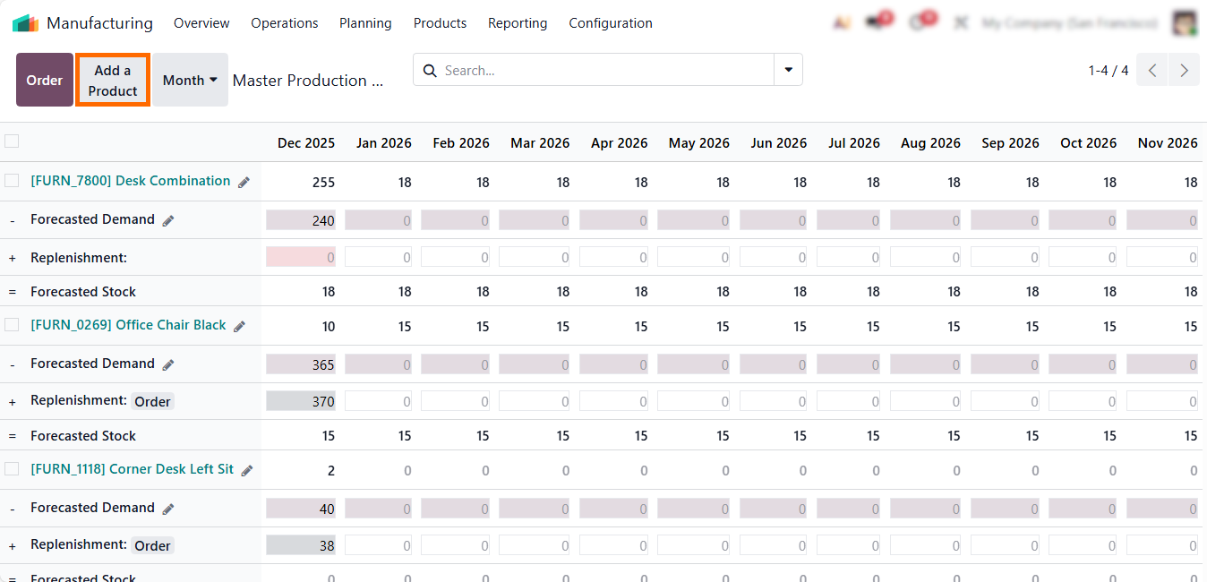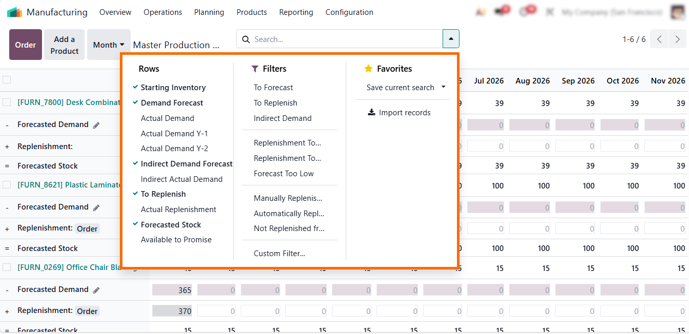 A focused Odoo master production schedule helps planners work faster and avoid noise in large catalogs. With filters by category, replenishment type, or planner, teams build a clean master scheduling workspace tailored to their roles. Custom rows allow grouping by demand patterns or planning horizons, simplifying navigation through large master production schedules. This structured layout improves visibility when comparing forecasts vs. actual demand, validating master production schedule format, or adjusting safety stock.